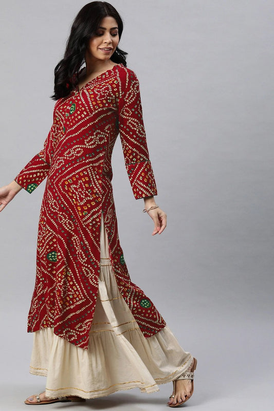 Rayon Blend Red And Beige Bandhani Printed Straight Kurta VCK1708E