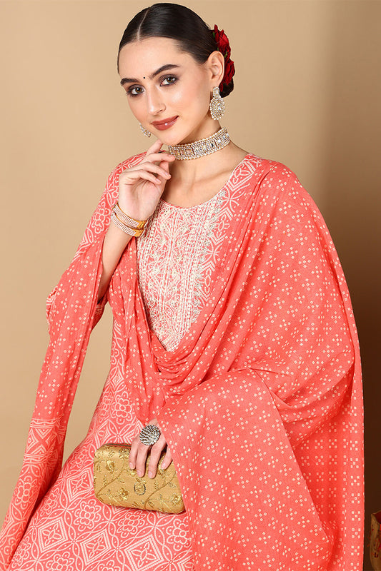 Peach Cotton Bandhani Printed Straight Suit Set VKSKD1986