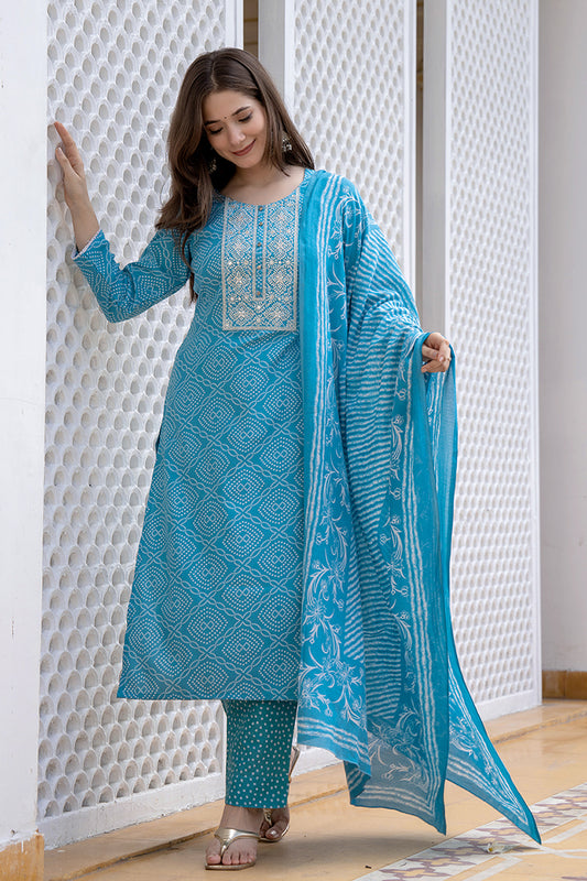 Cotton Blue Bandhani Printed Straight Kurta Pant With Dupatta VKSKD1925