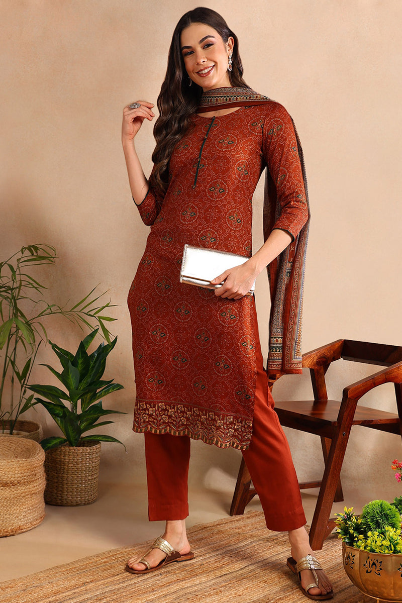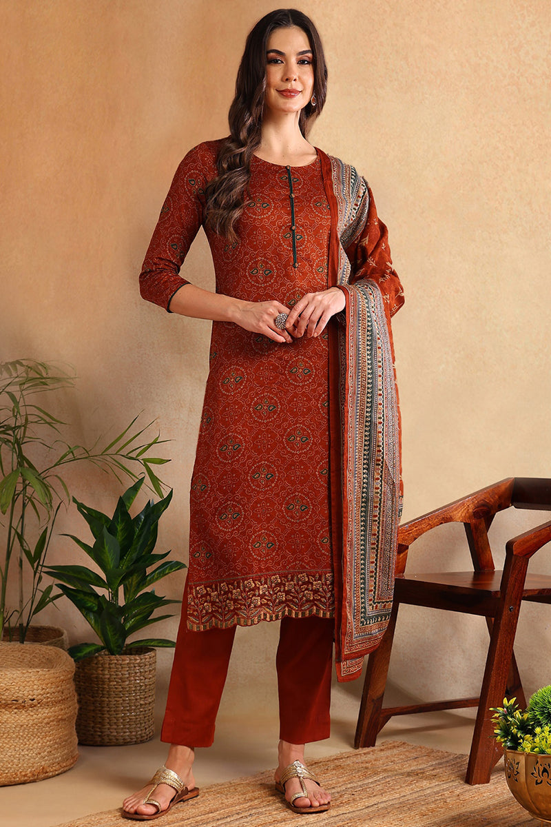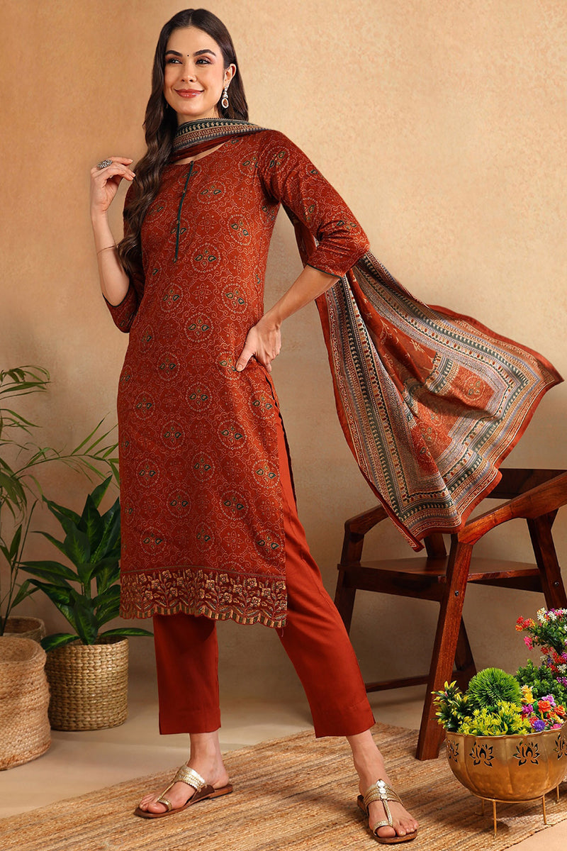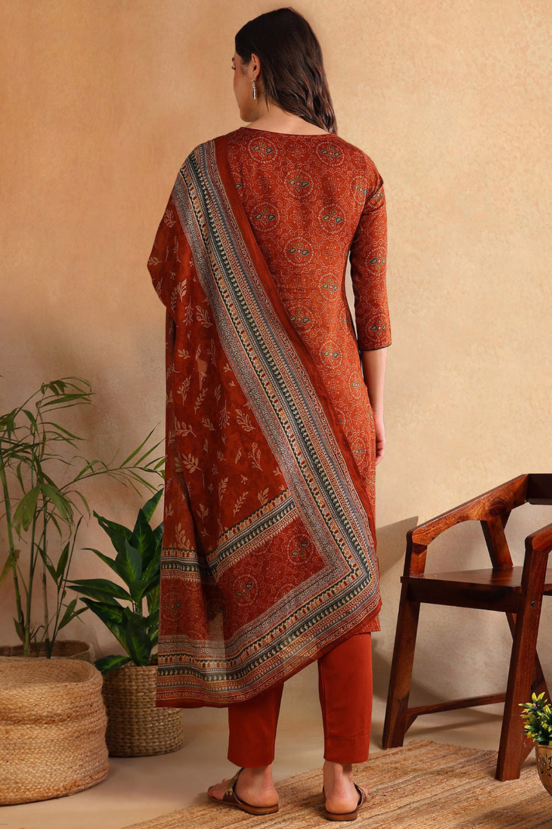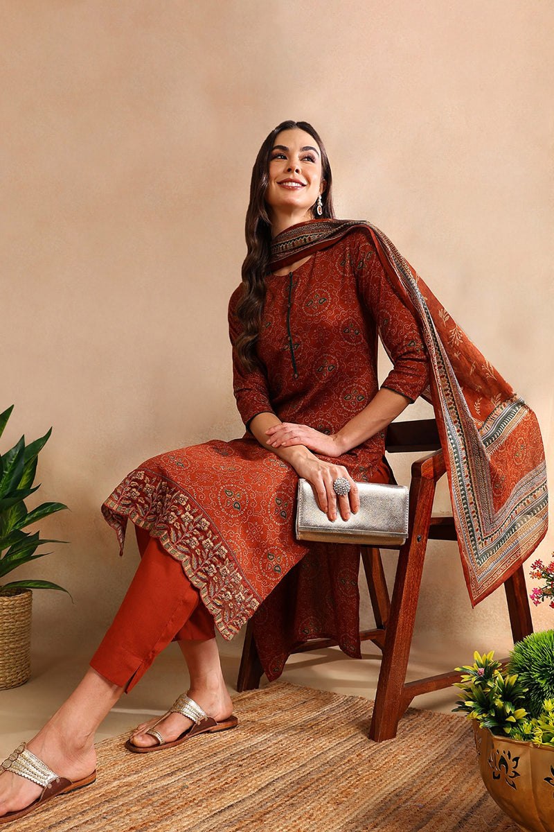 Rust printed Kurta with Trousers & dupatta