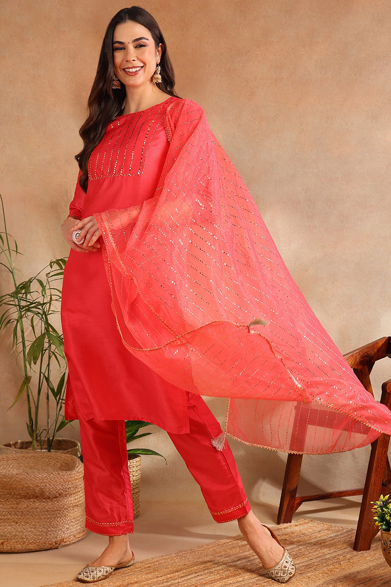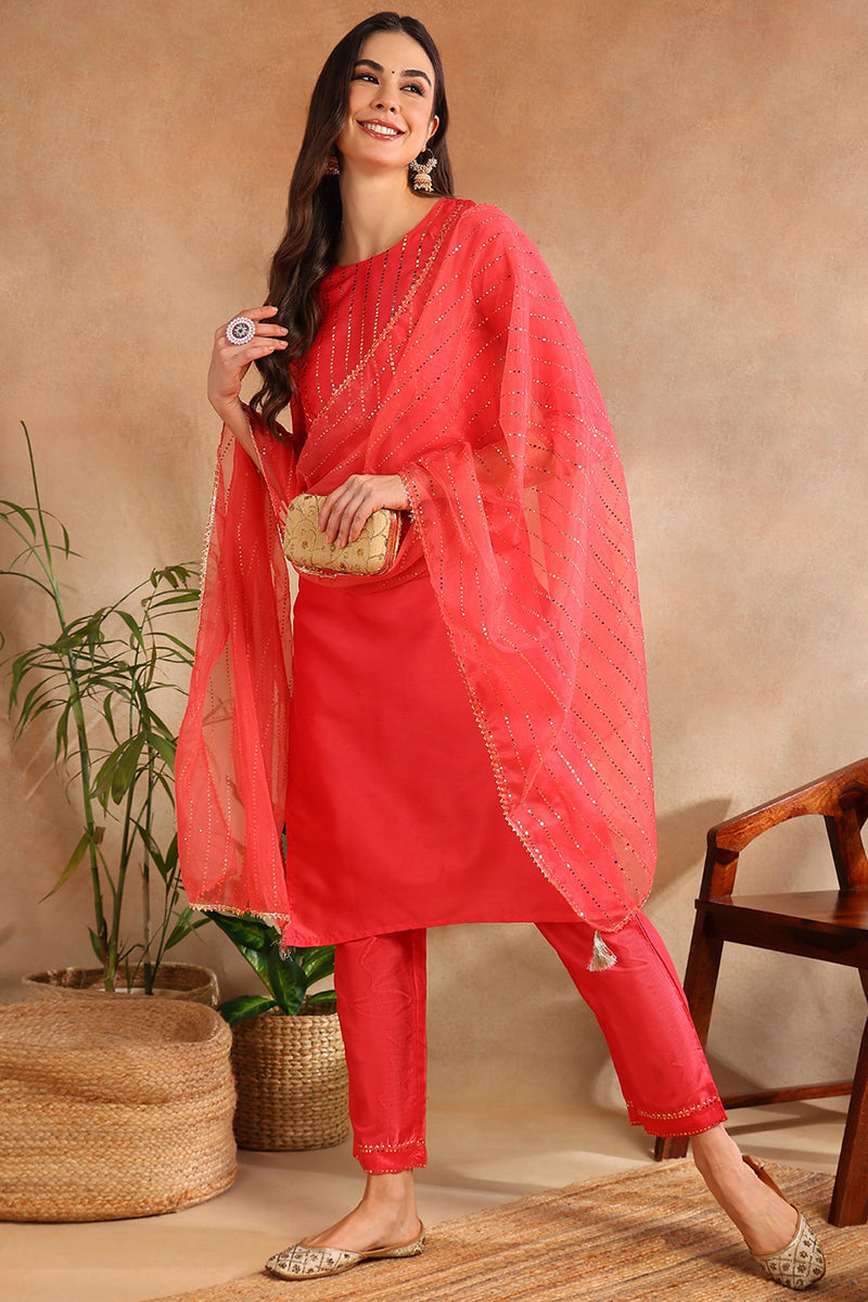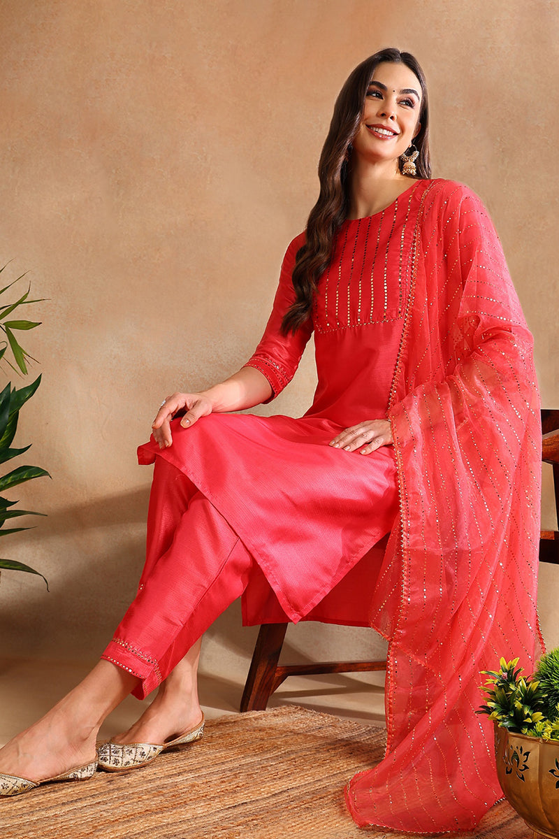 Fuchsia Poly Chanderi Solid Straight Suit Set PKSKD1089