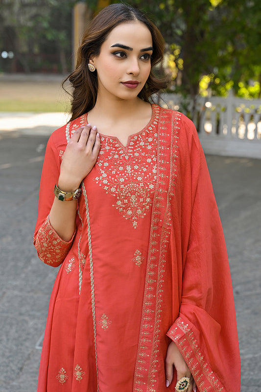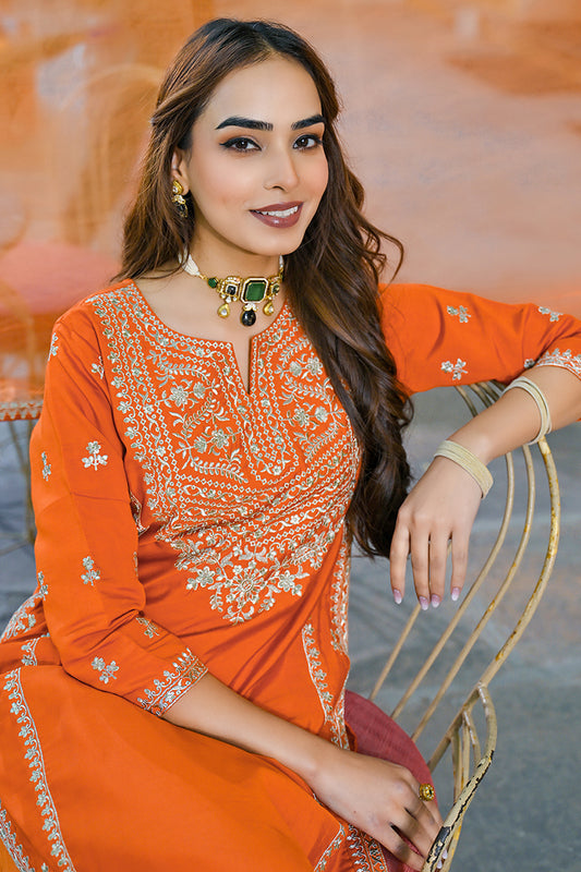 Orange Silk Blend Solid Embroidered Straight Suit Set PKSKD2839
