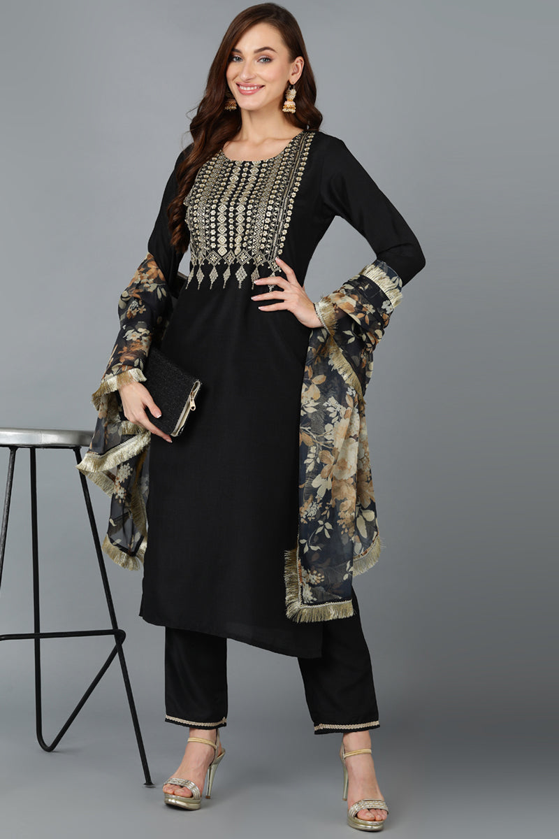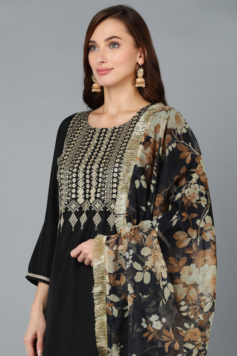 Black Silk Blend Yoke Design Kurta Pant With Dupatta PKSKD1869