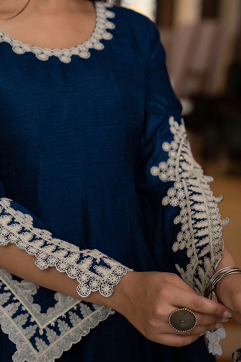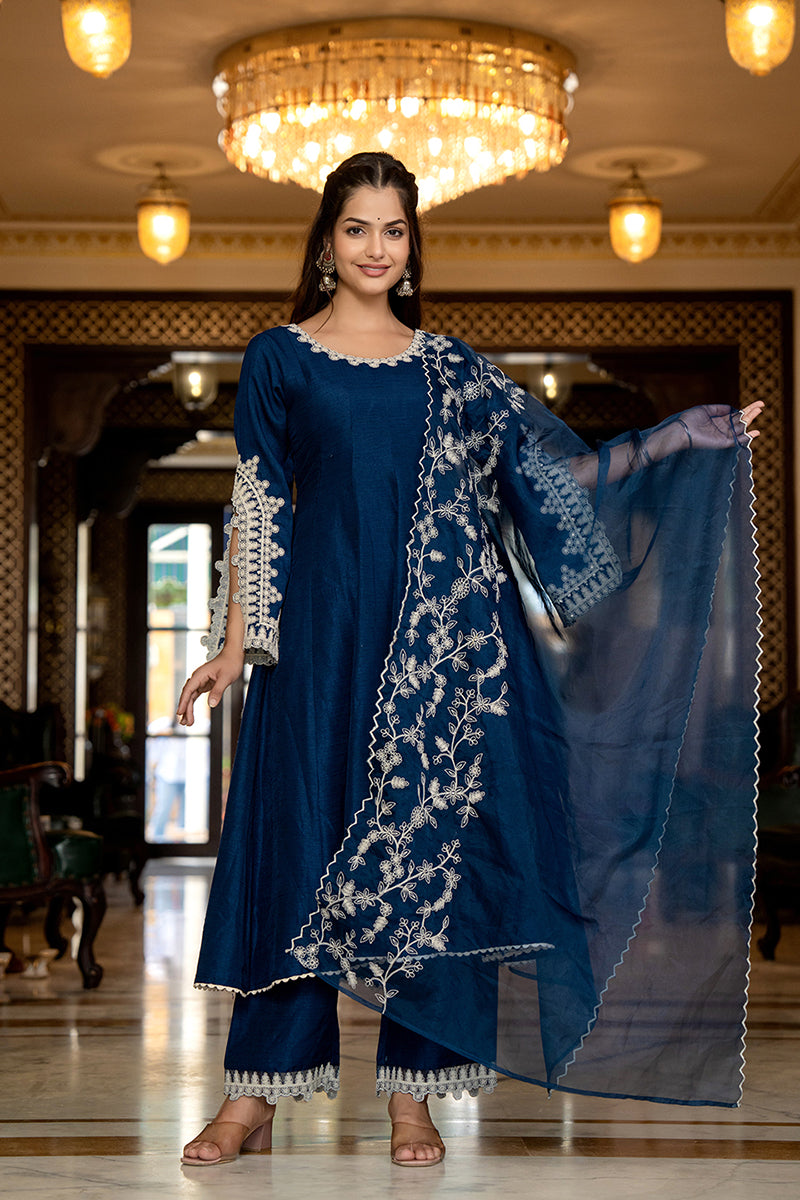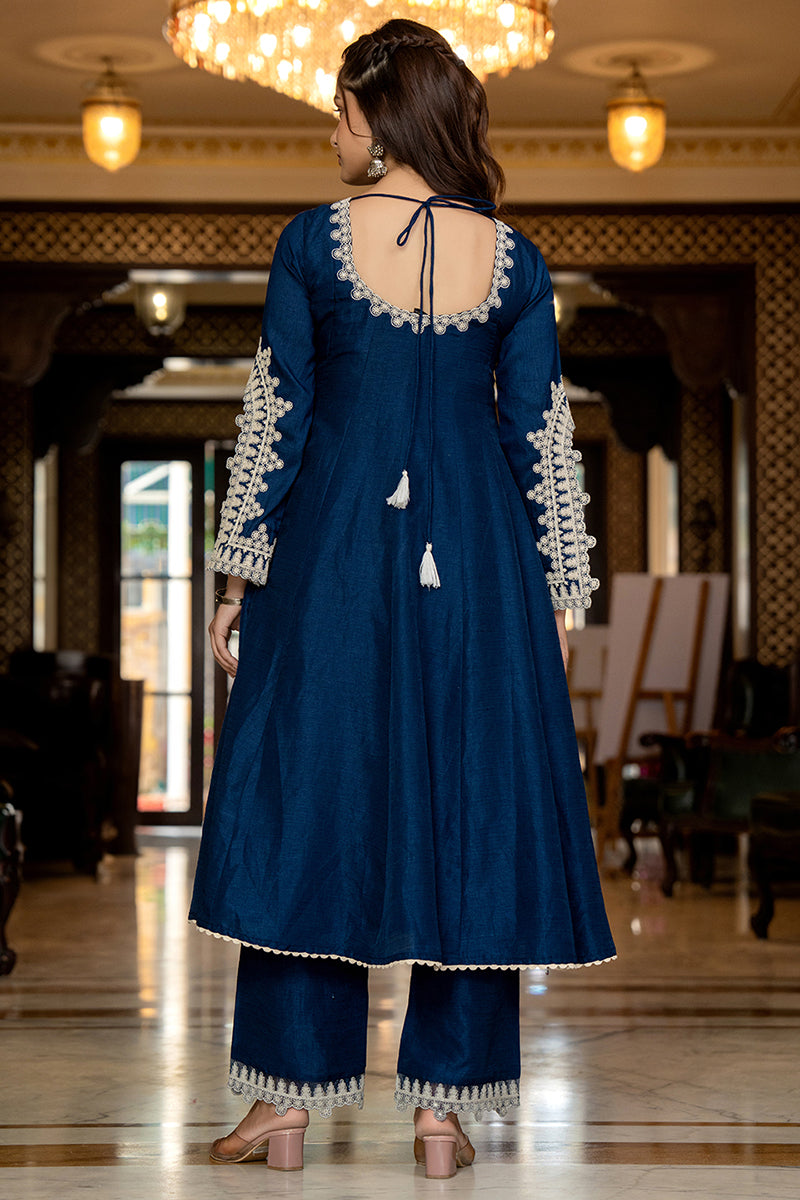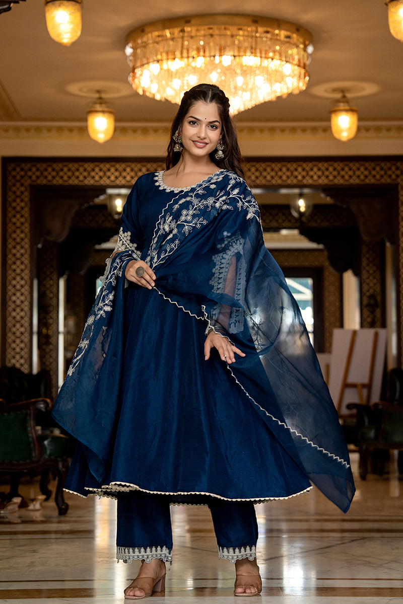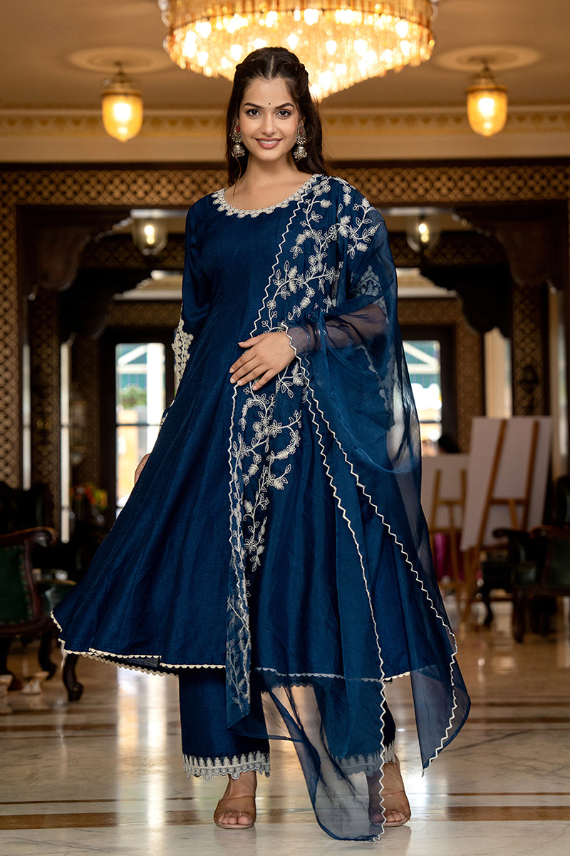 Blue Silk Blend Solid Embroidered Anarkali Kurta Palazzo With Dupatta PKSKD2397