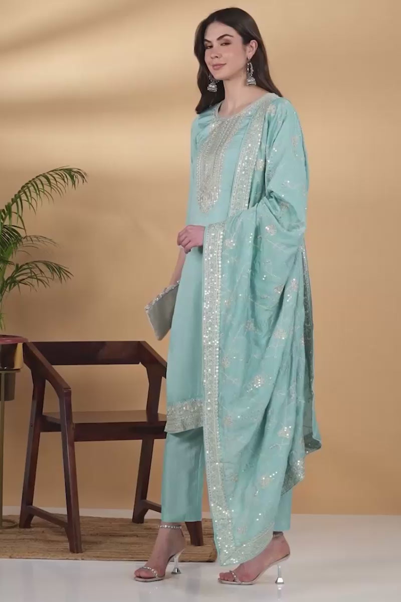 Turquoise blue embroidered Kurta with Trousers & dupatta