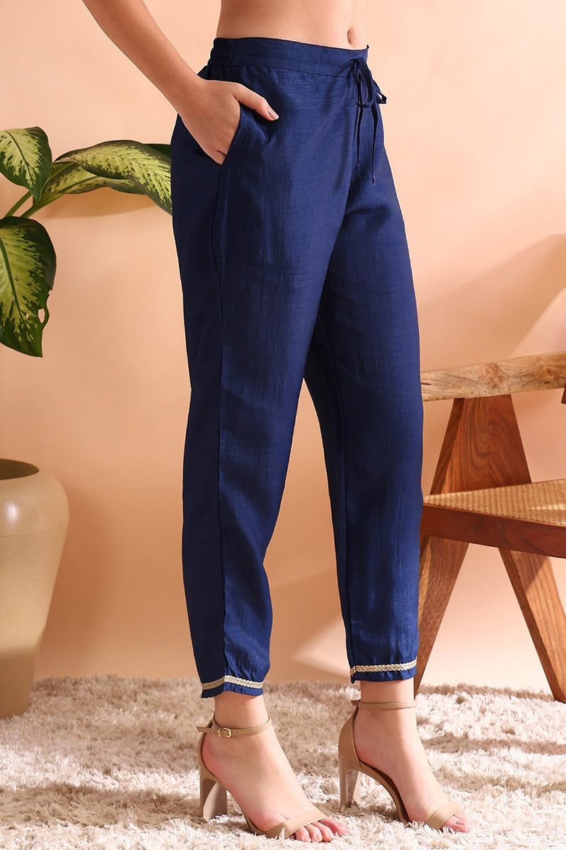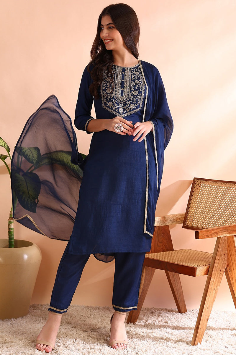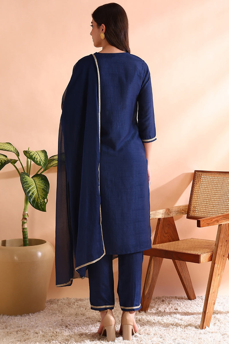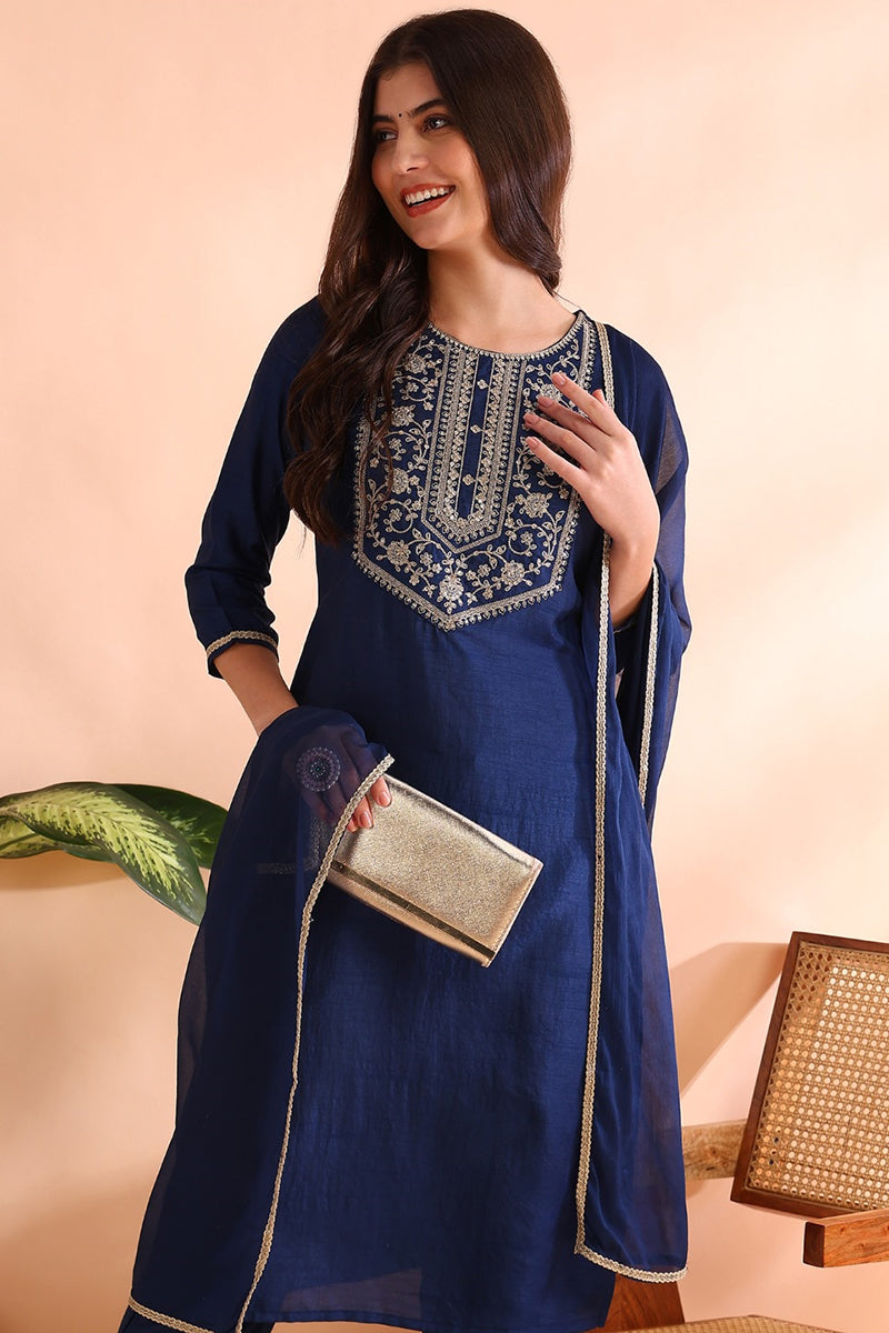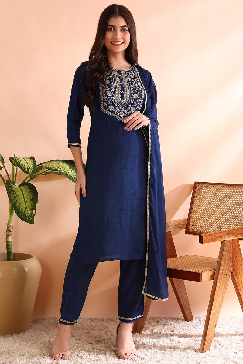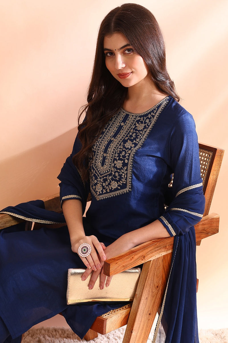 Blue Silk Blend Straight Yoke Design Kurta Pant With Dupatta PKSKD1809