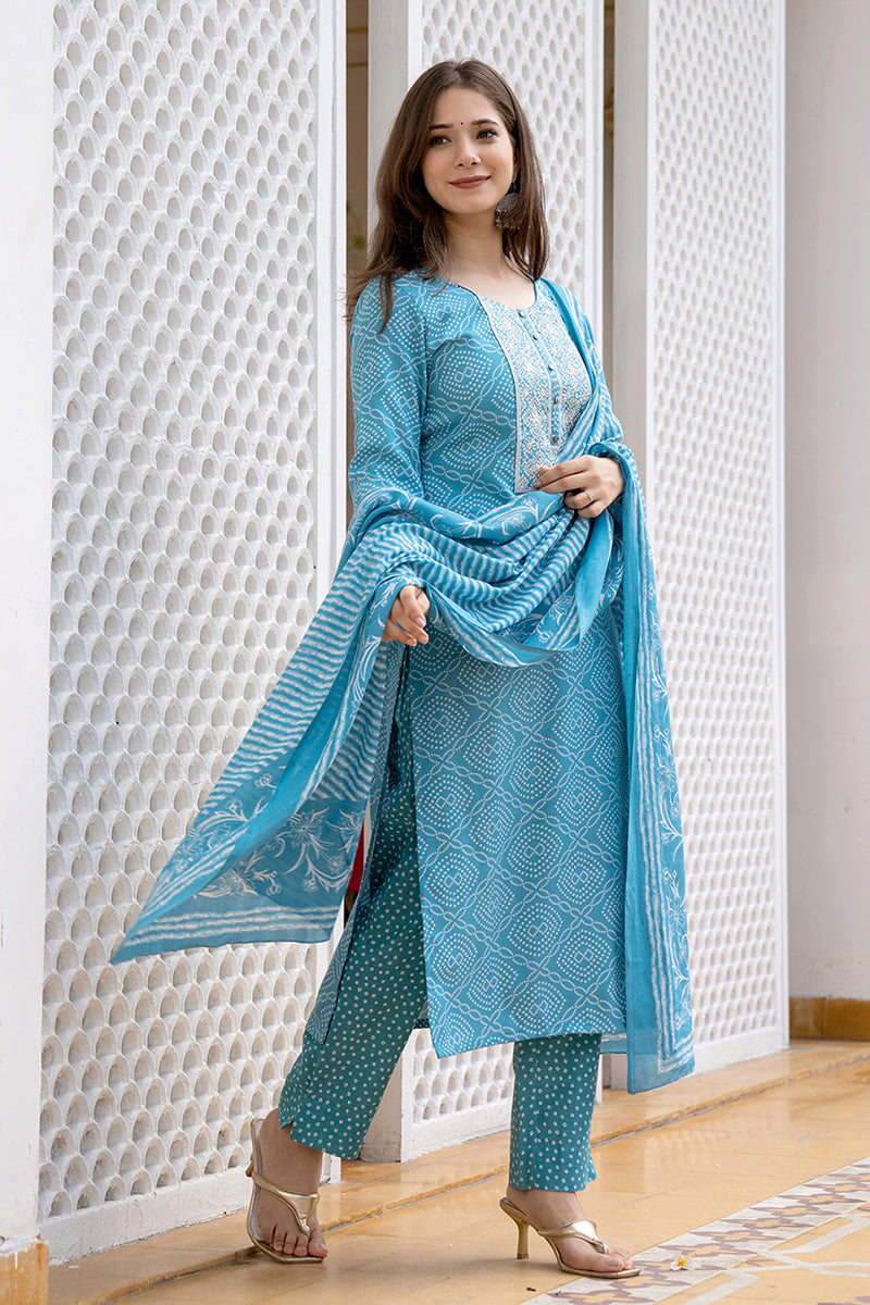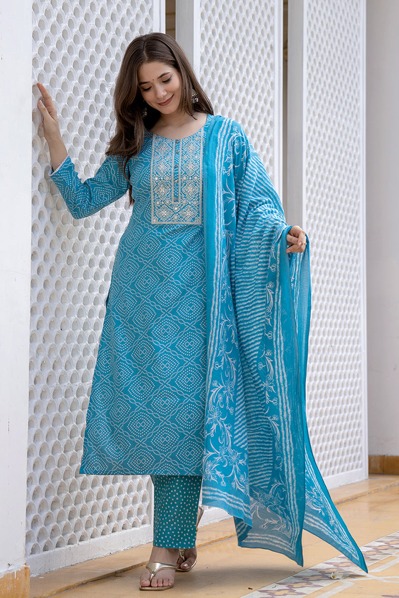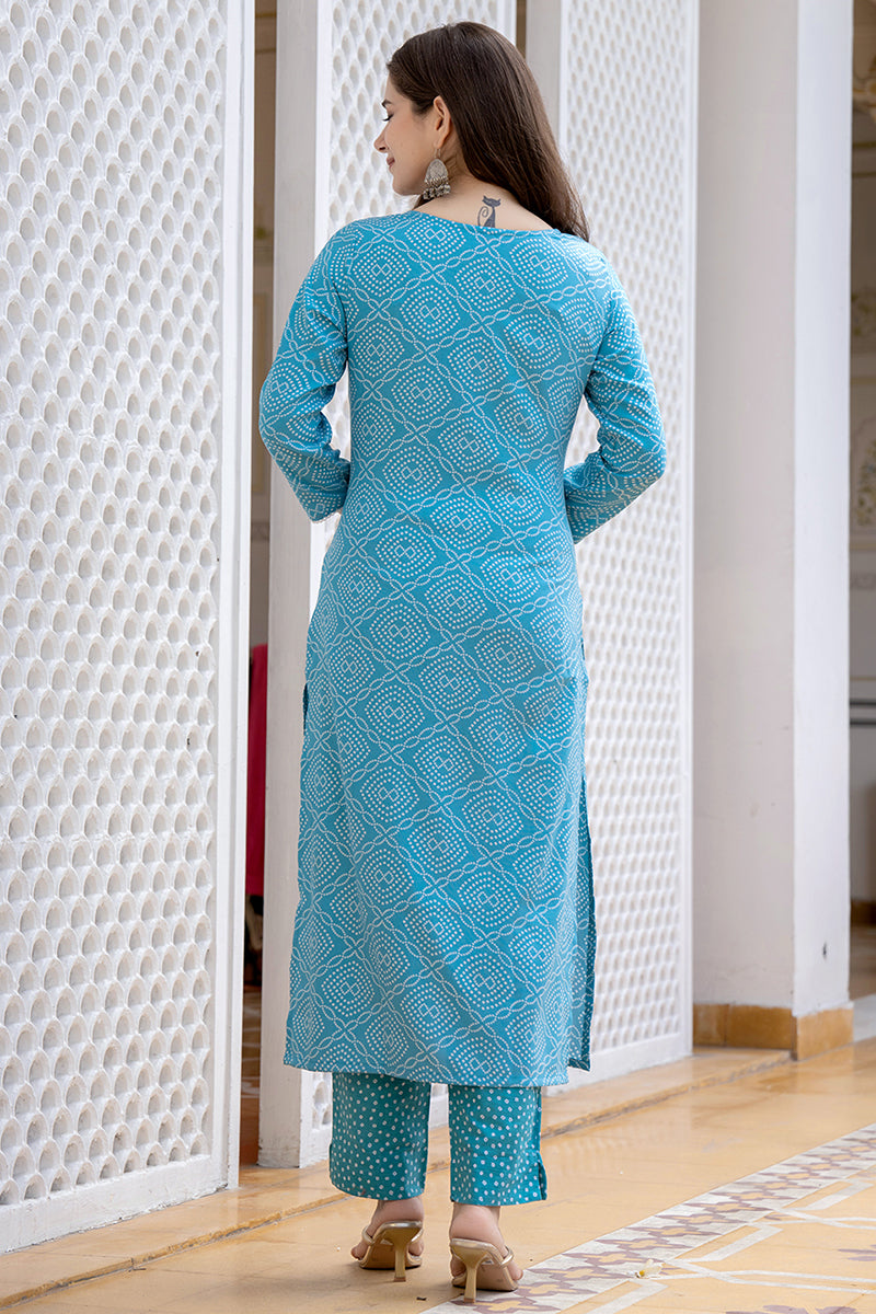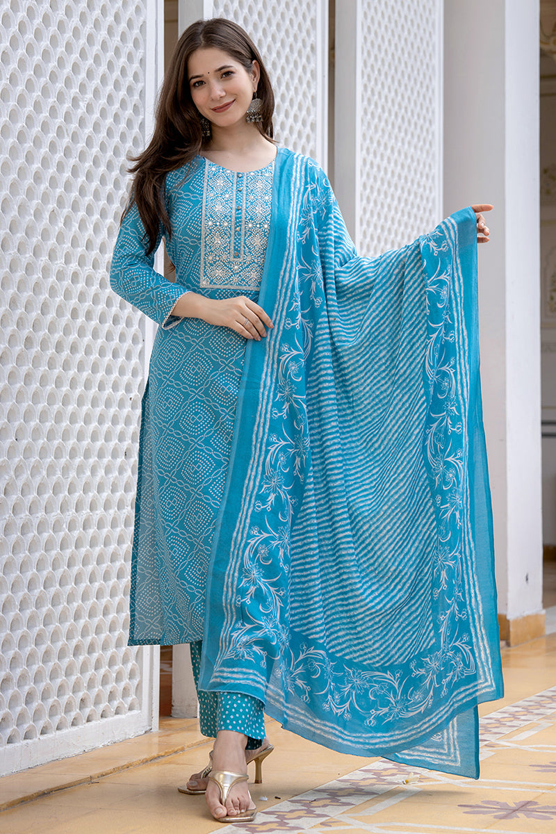 Blue Viscose Rayon Bandhani Embroidered Straight Suit Set VKSKD2183