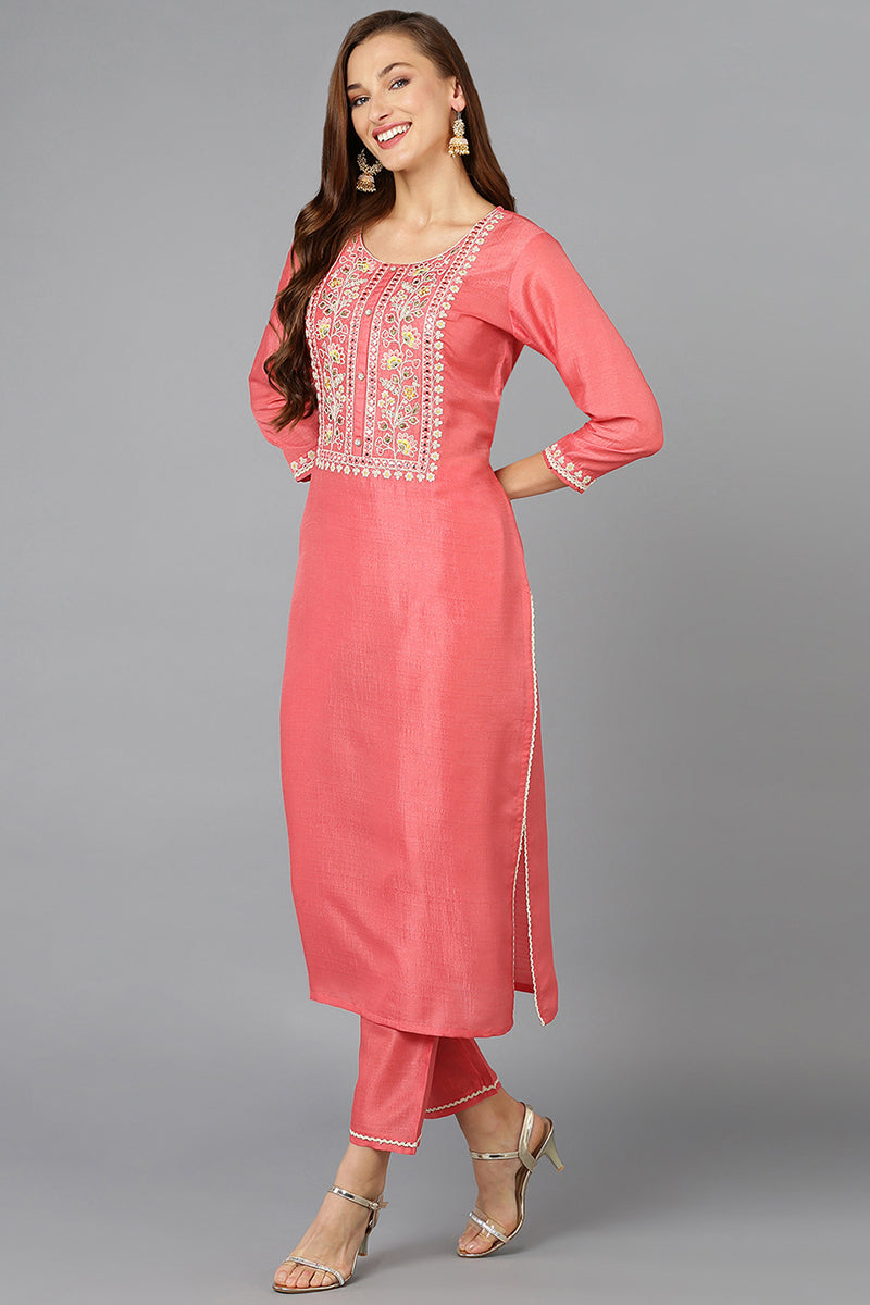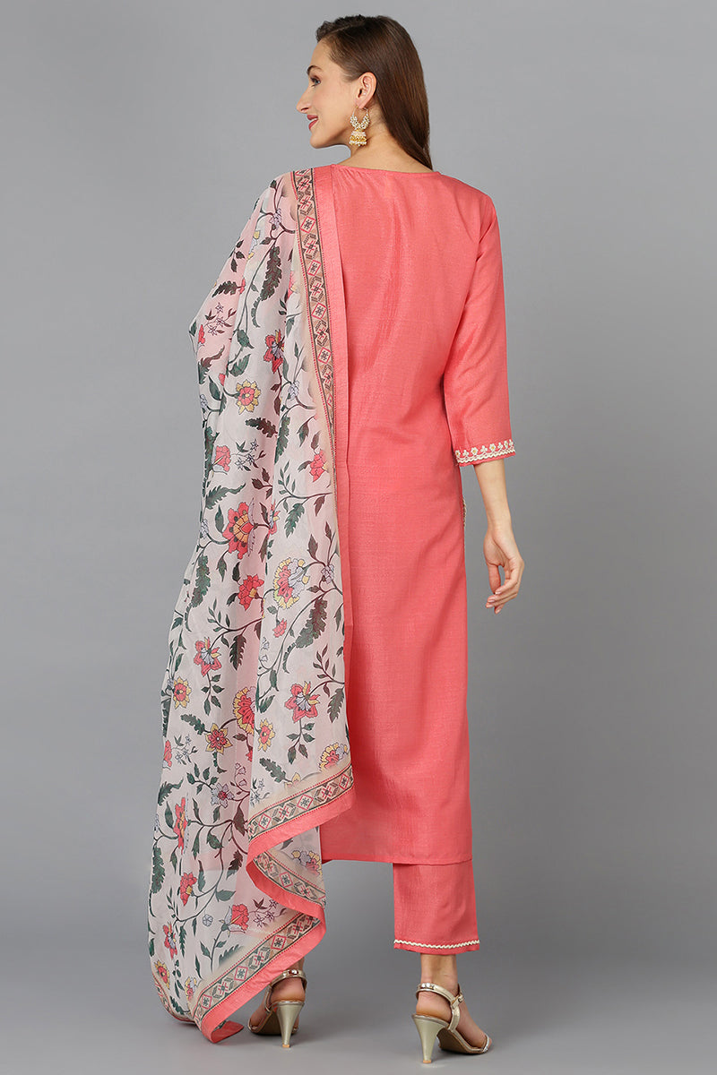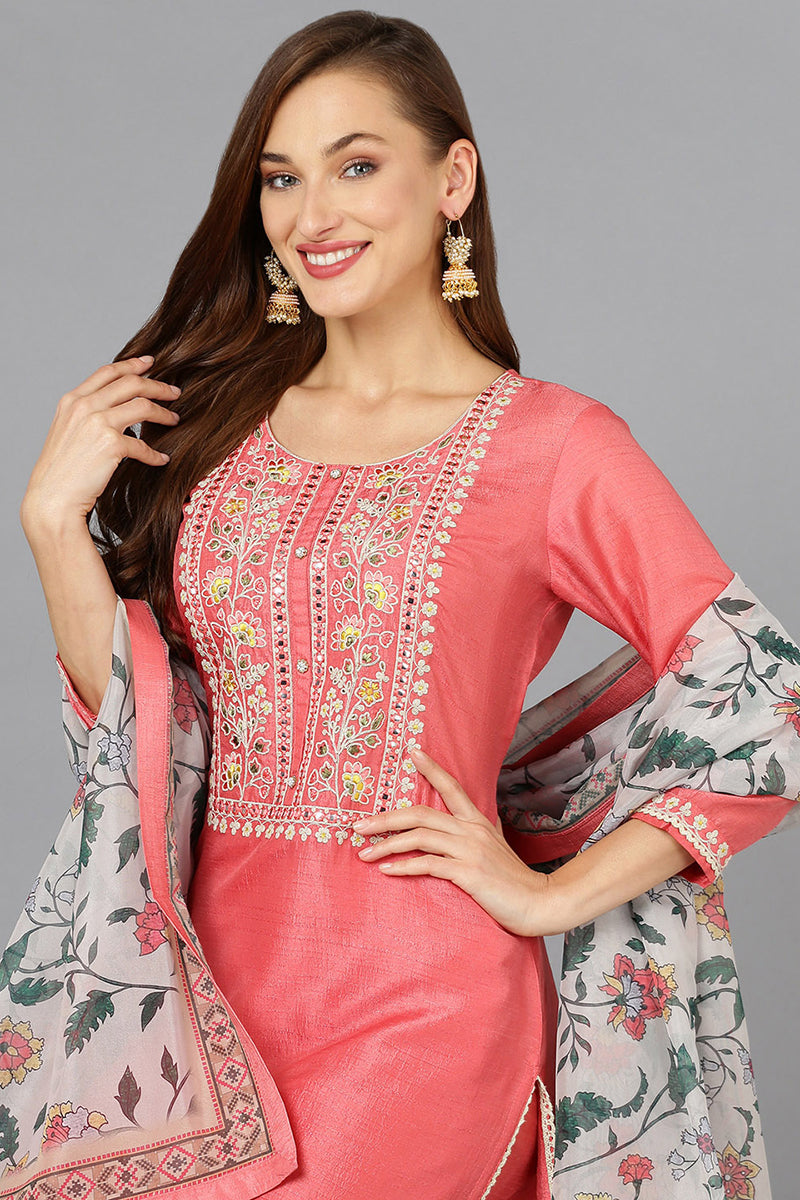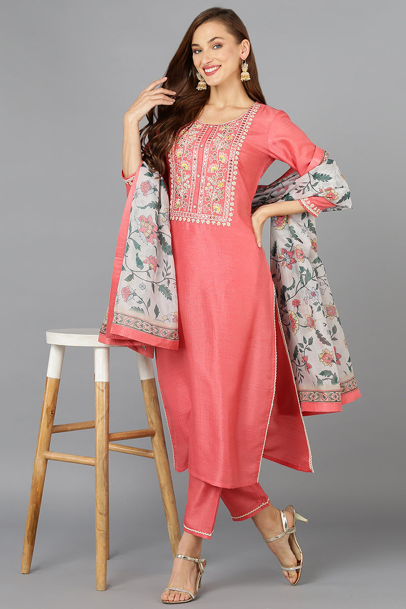 Coral Pink Silk Blend Straight Kurta Pant With Dupatta PKSKD1922