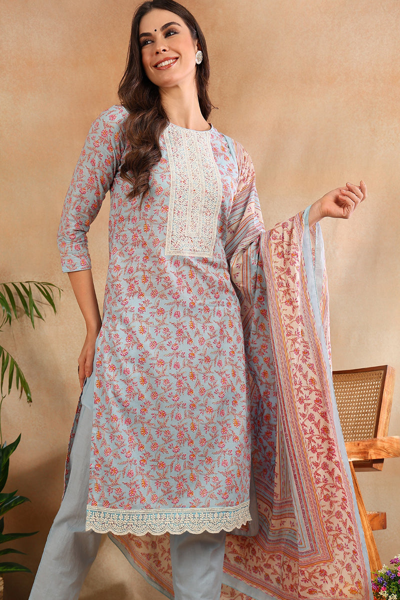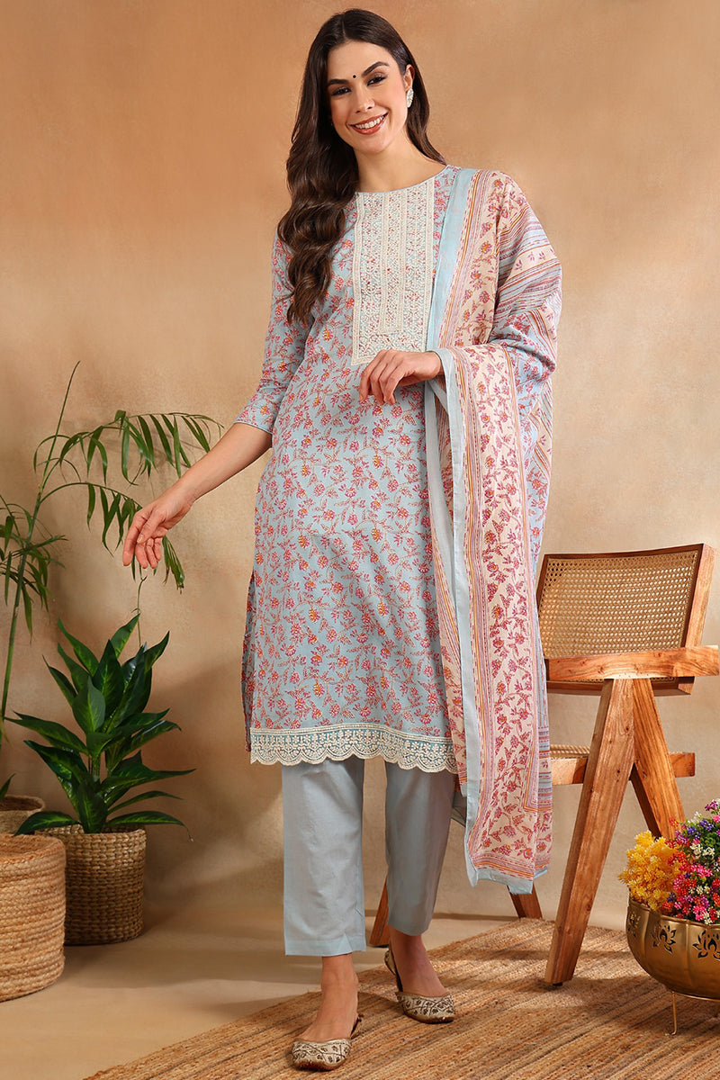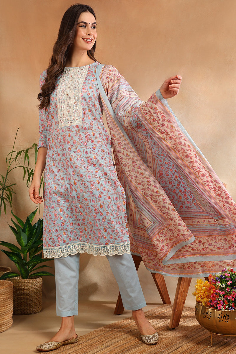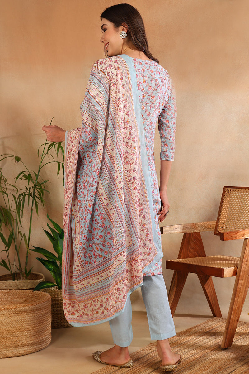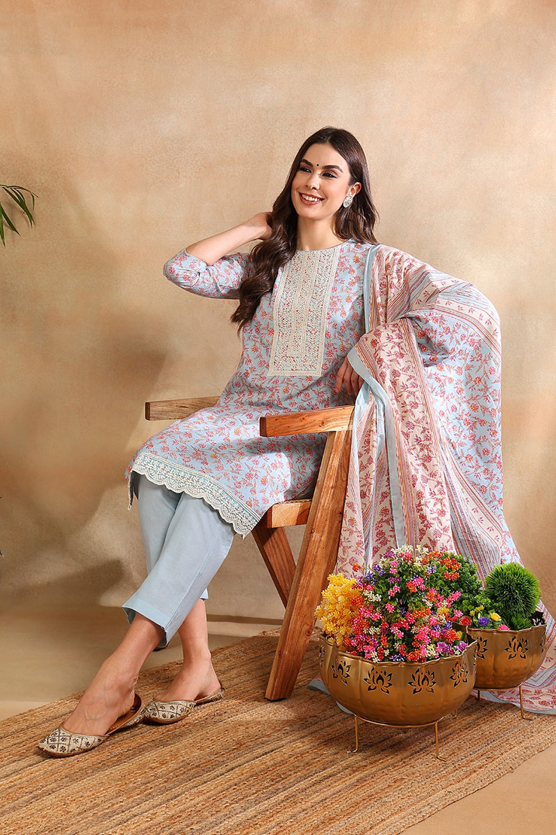 Blue Cotton Blend Floral Straight Suit Set VKSKD1902