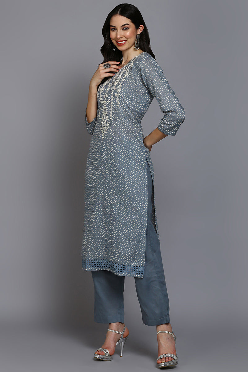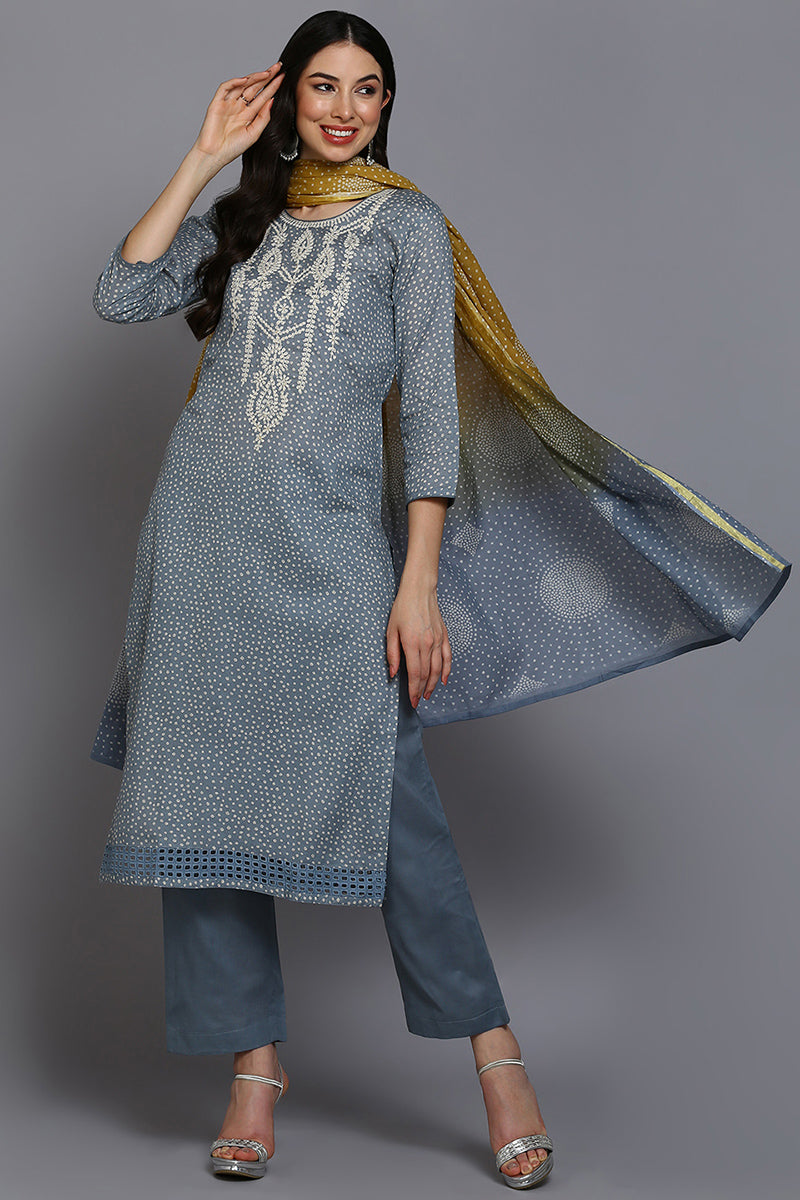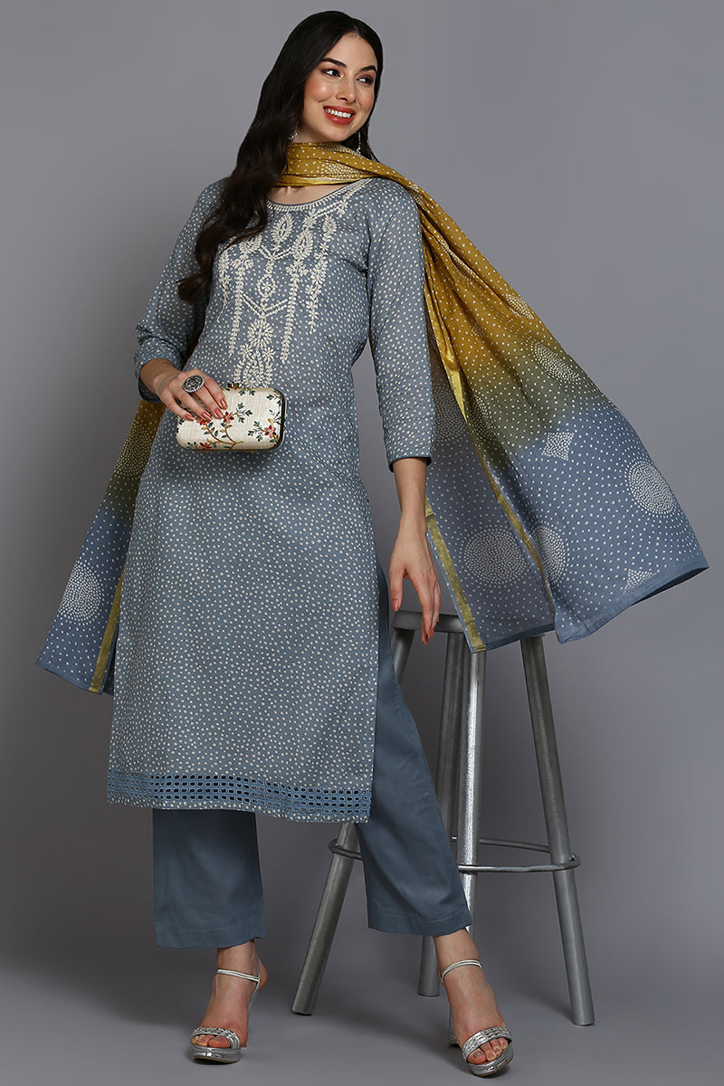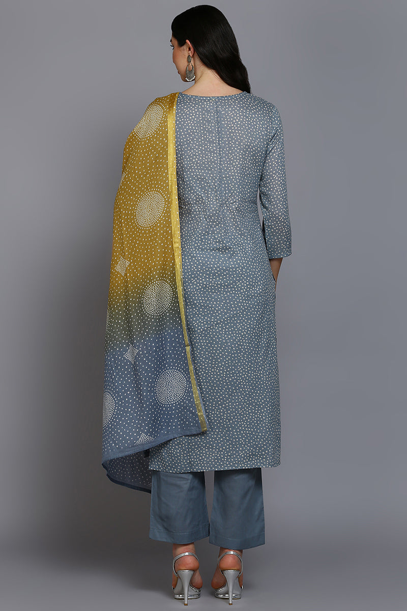 Grey Cotton Bandhani Straight Suit Set VKSKD1873