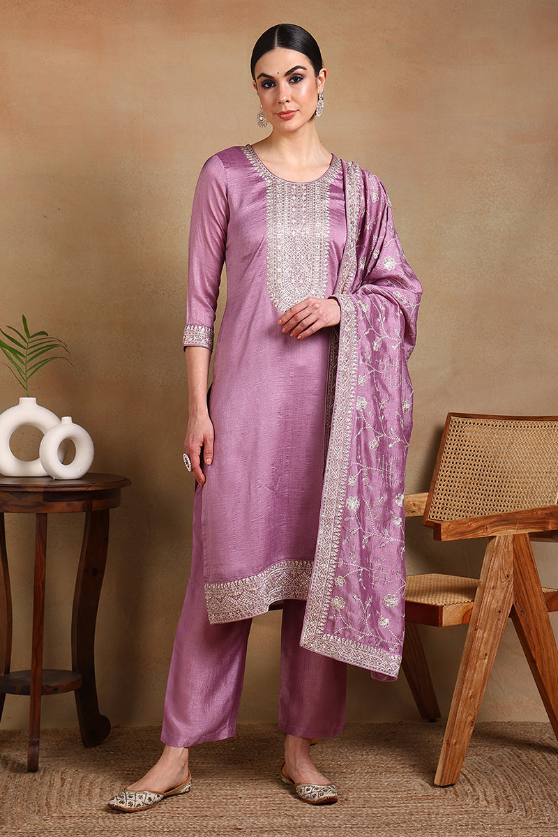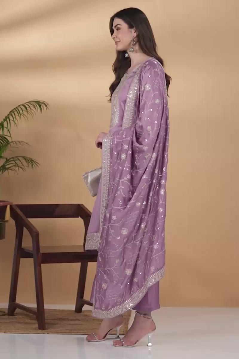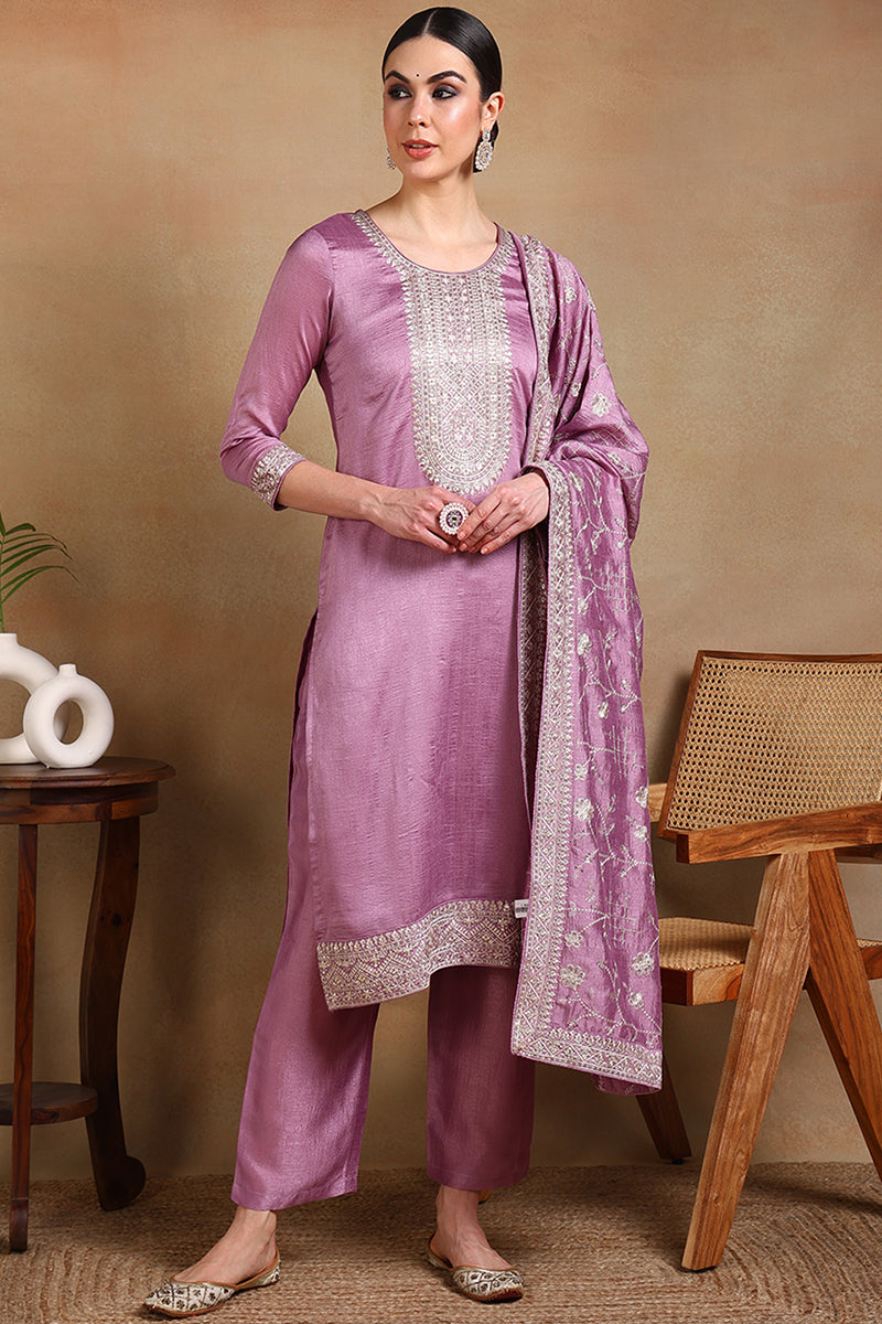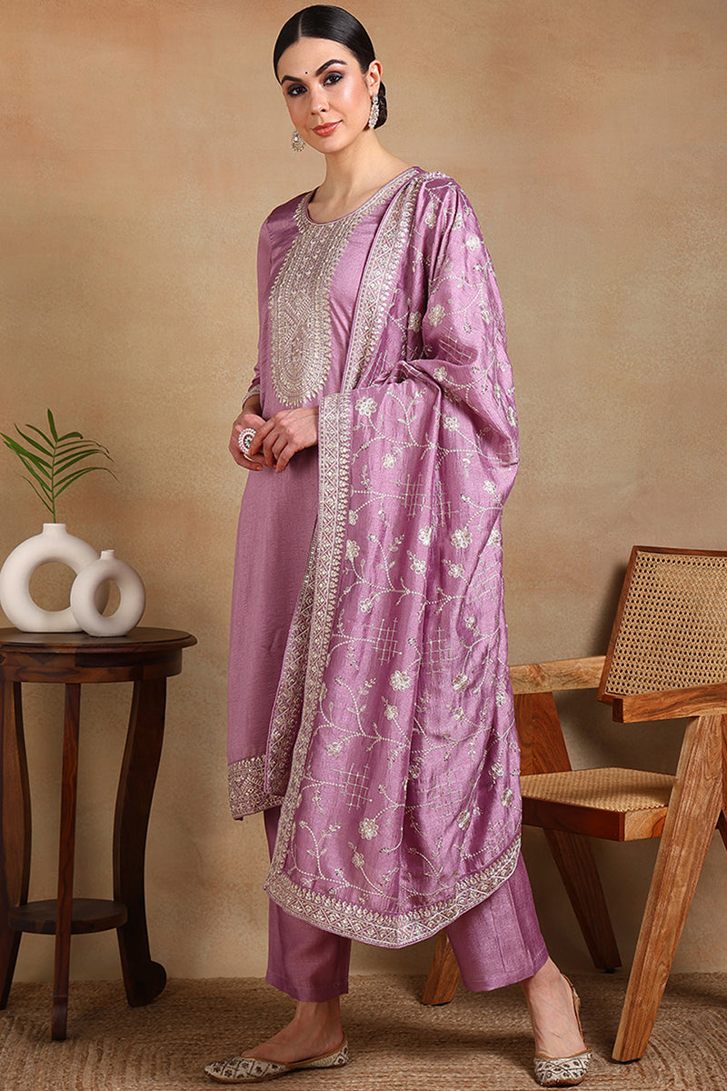 Lavender Silk Blend Straight Kurta Pant With Dupatta PKSKD1898