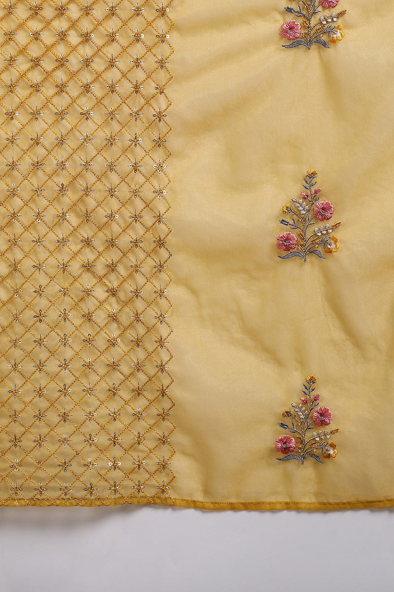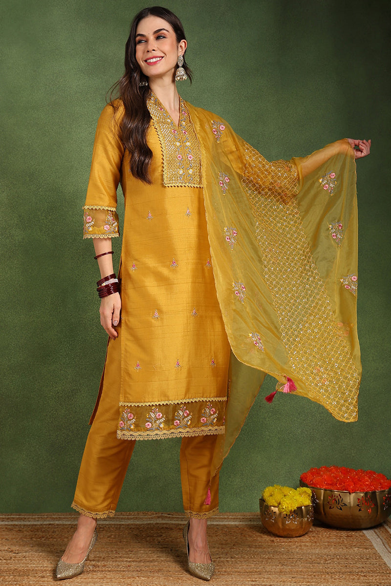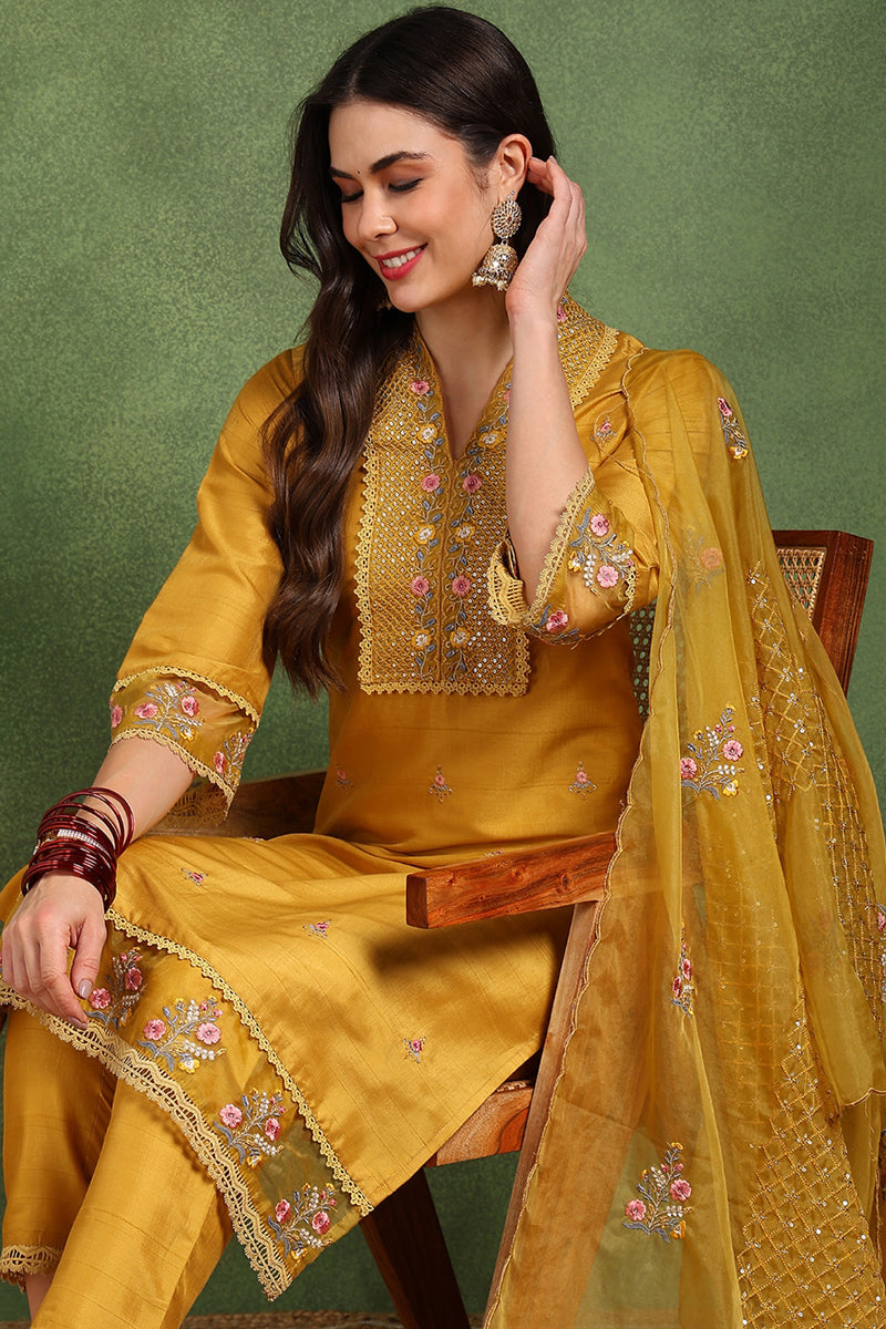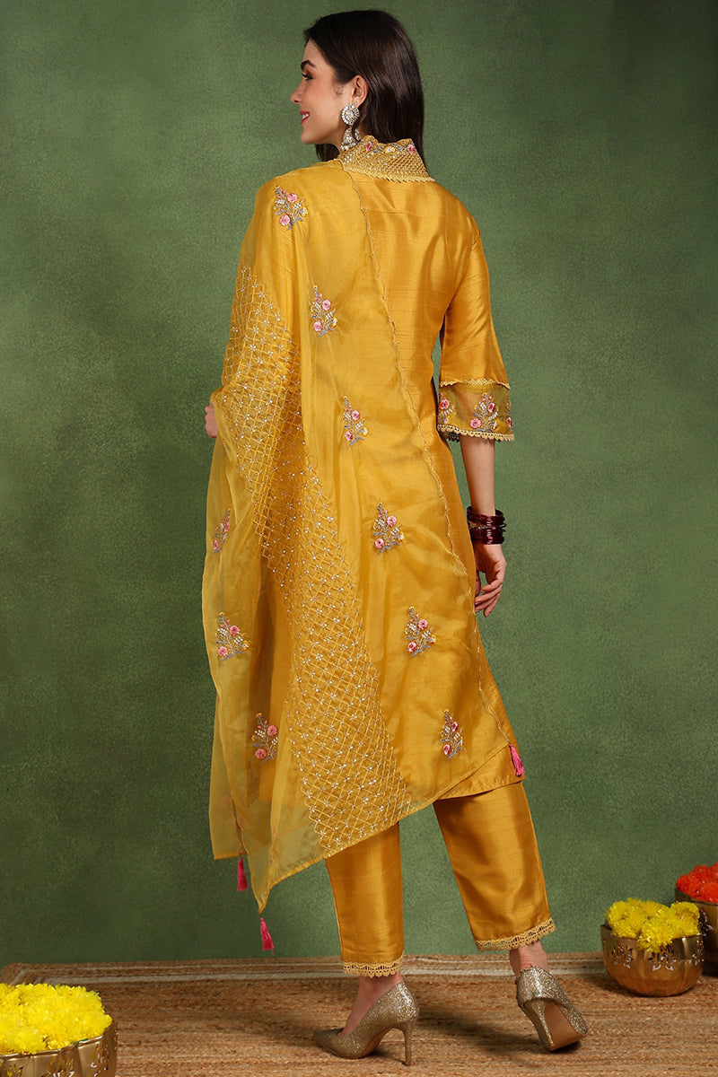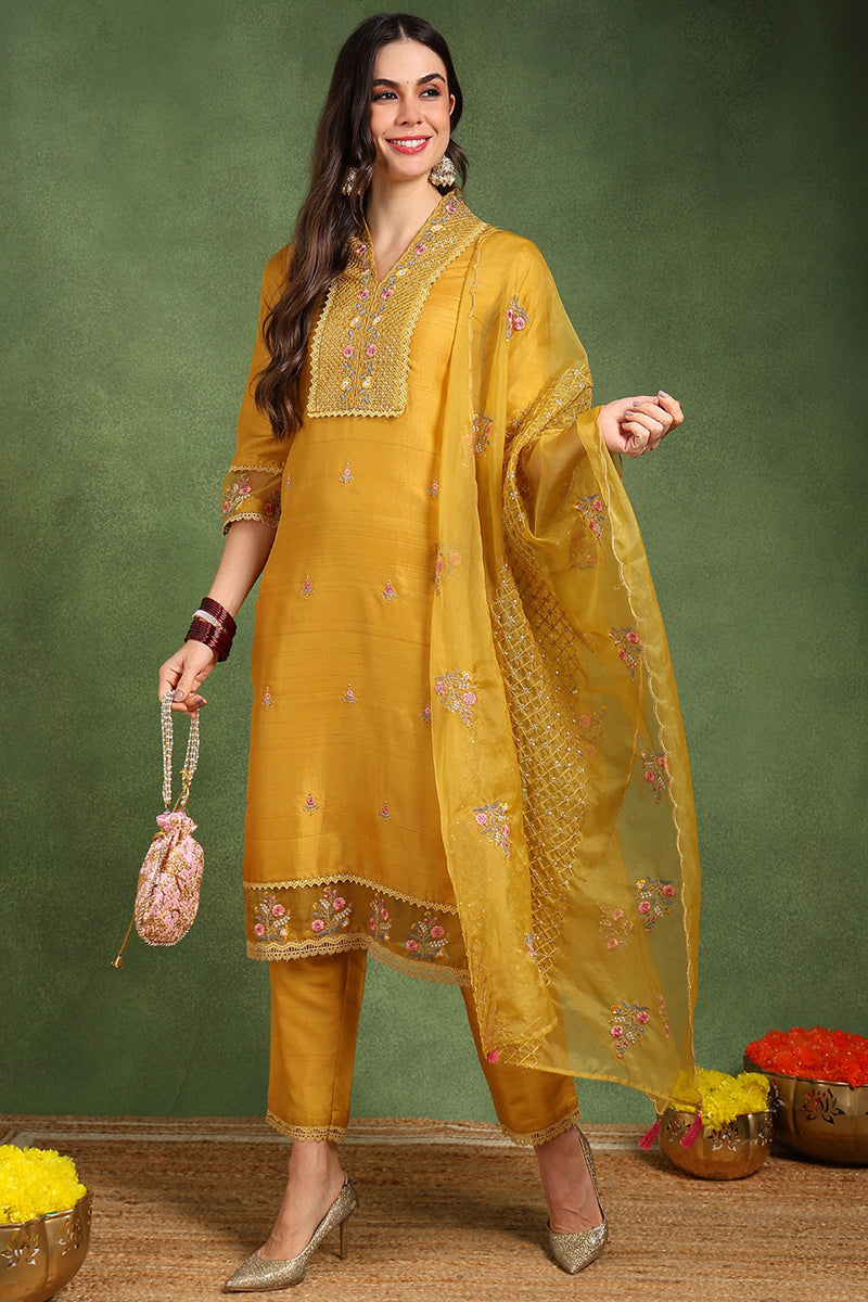 Mustard Yellow Silk Blend Floral Embroidered Straight Suit Set PKSKD2240