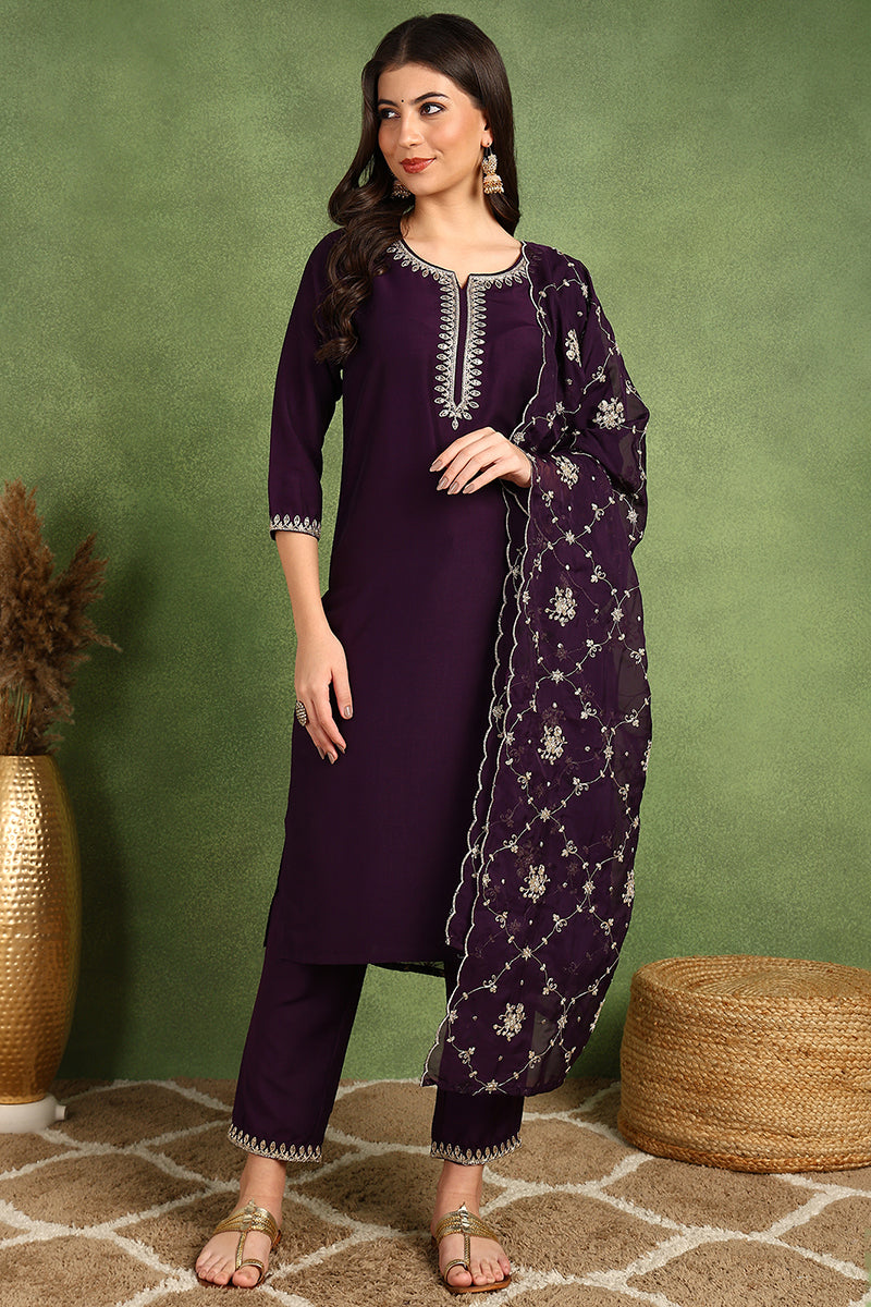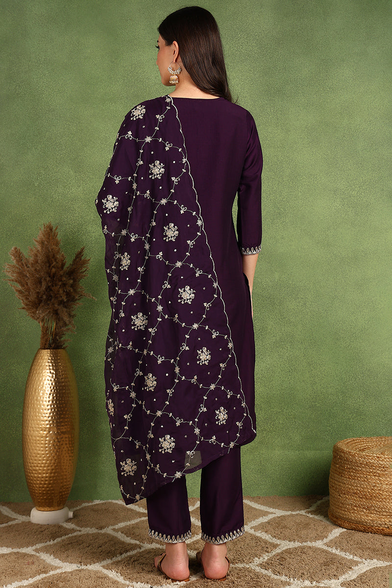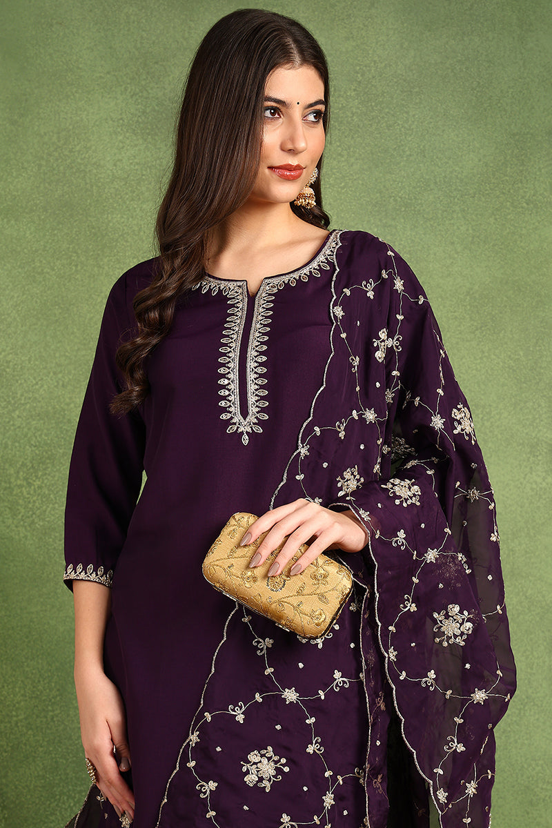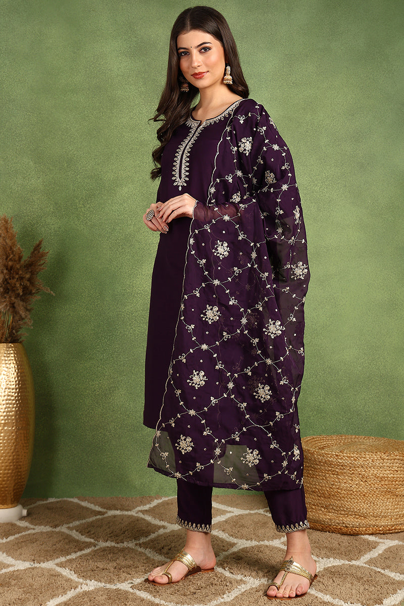 Purple Silk Blend Straight Kurta Pant With Dupatta VKSKD1774