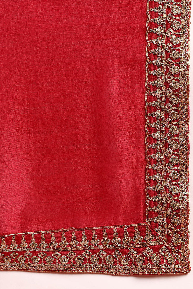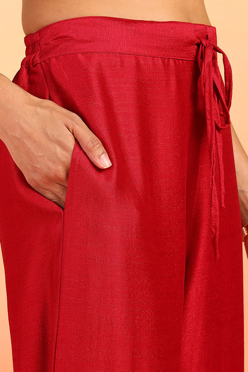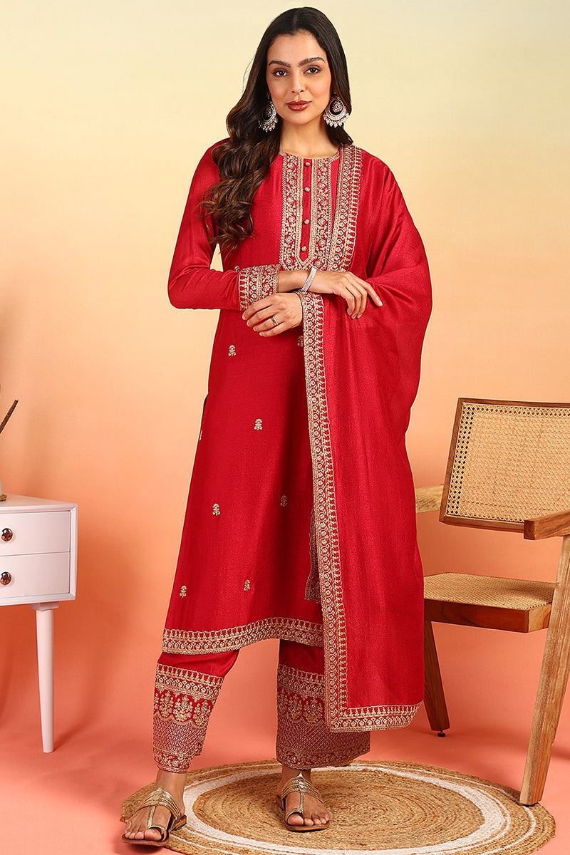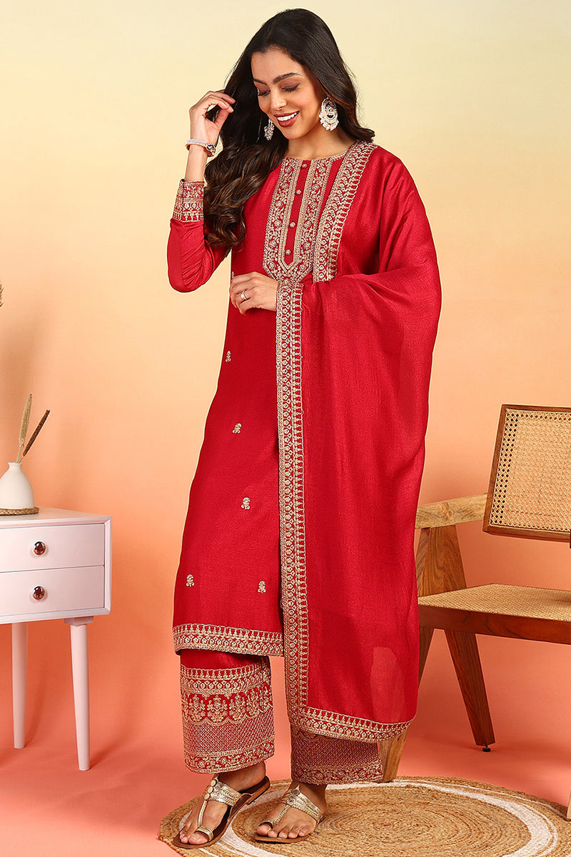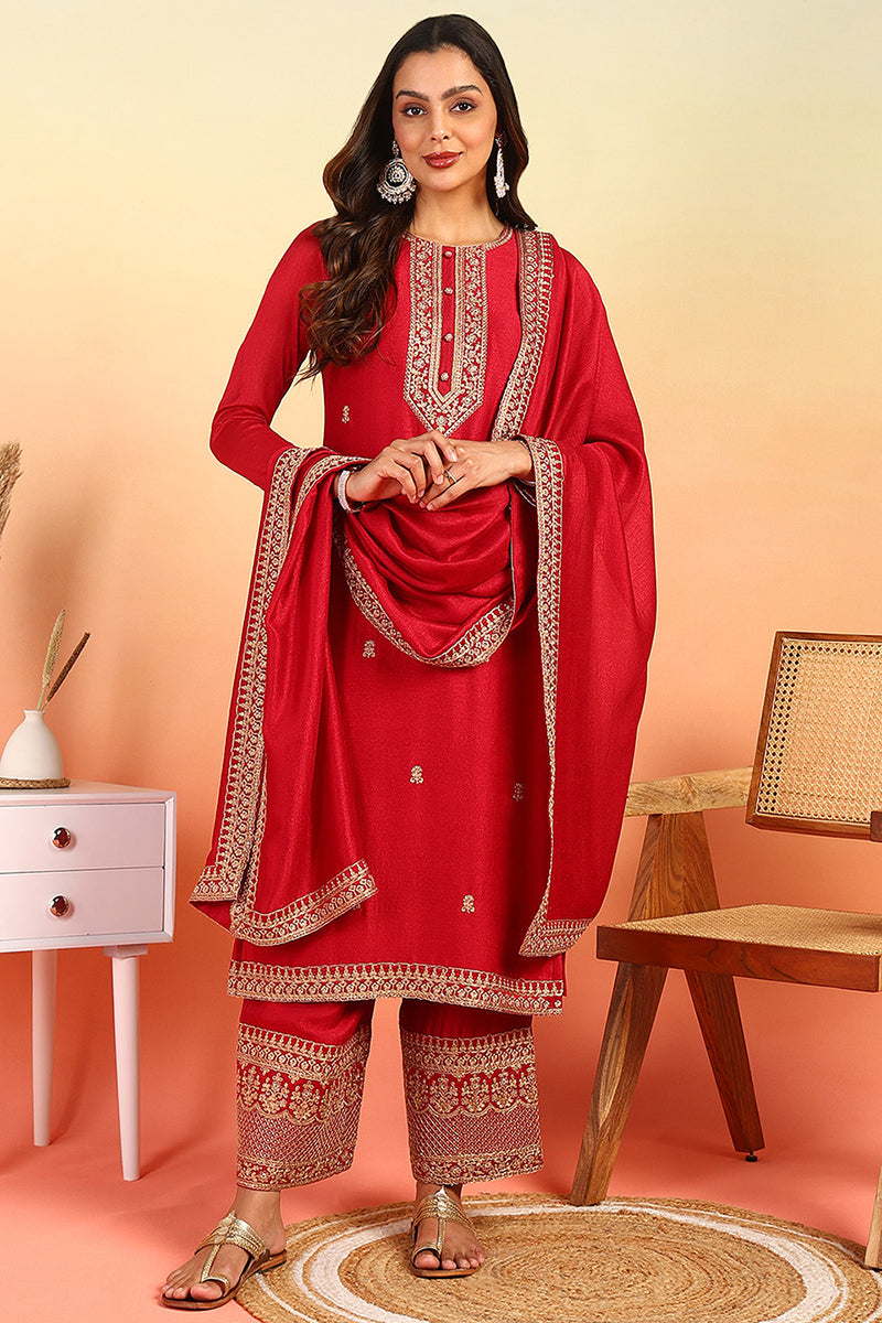 Red Silk Blend Solid Embroidered Straight Palazzo Suit Set PKSKD2399