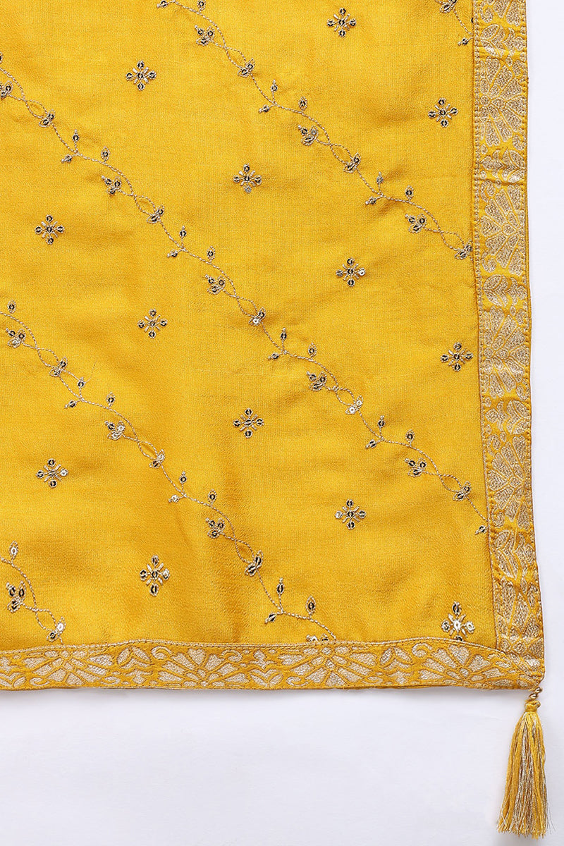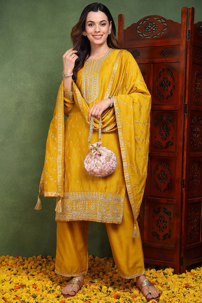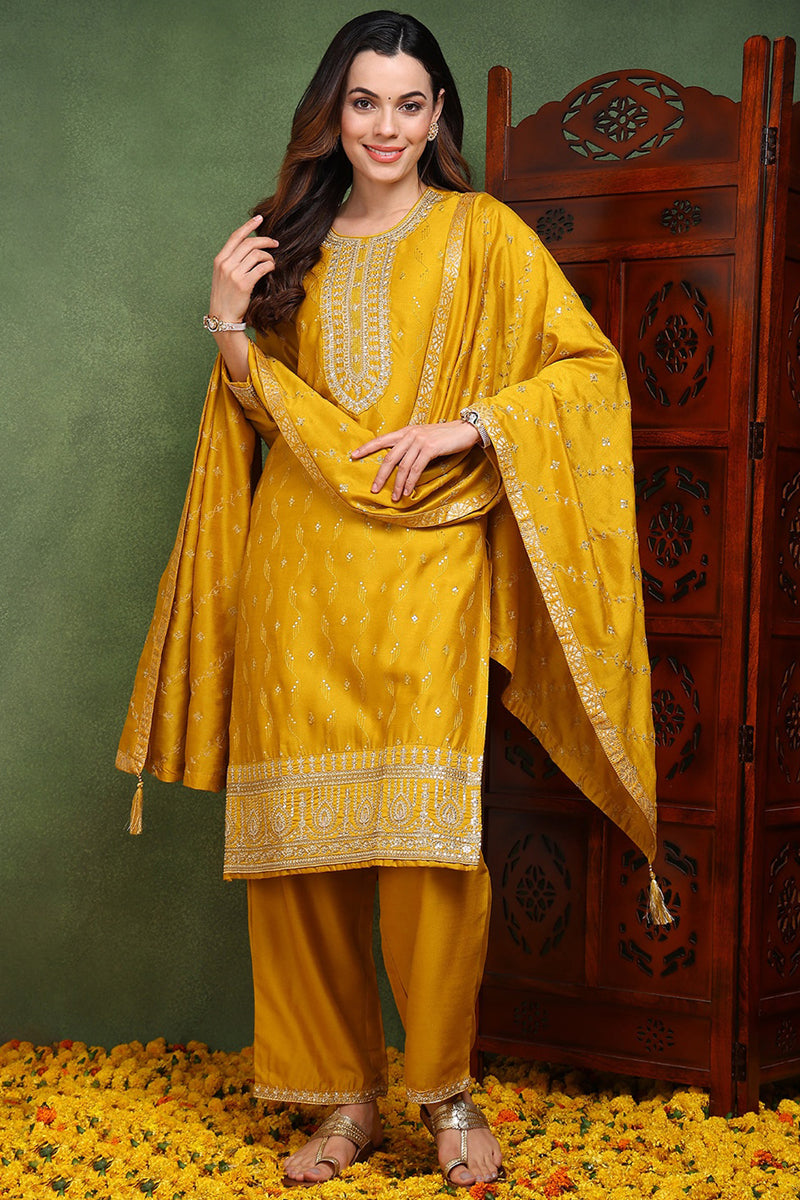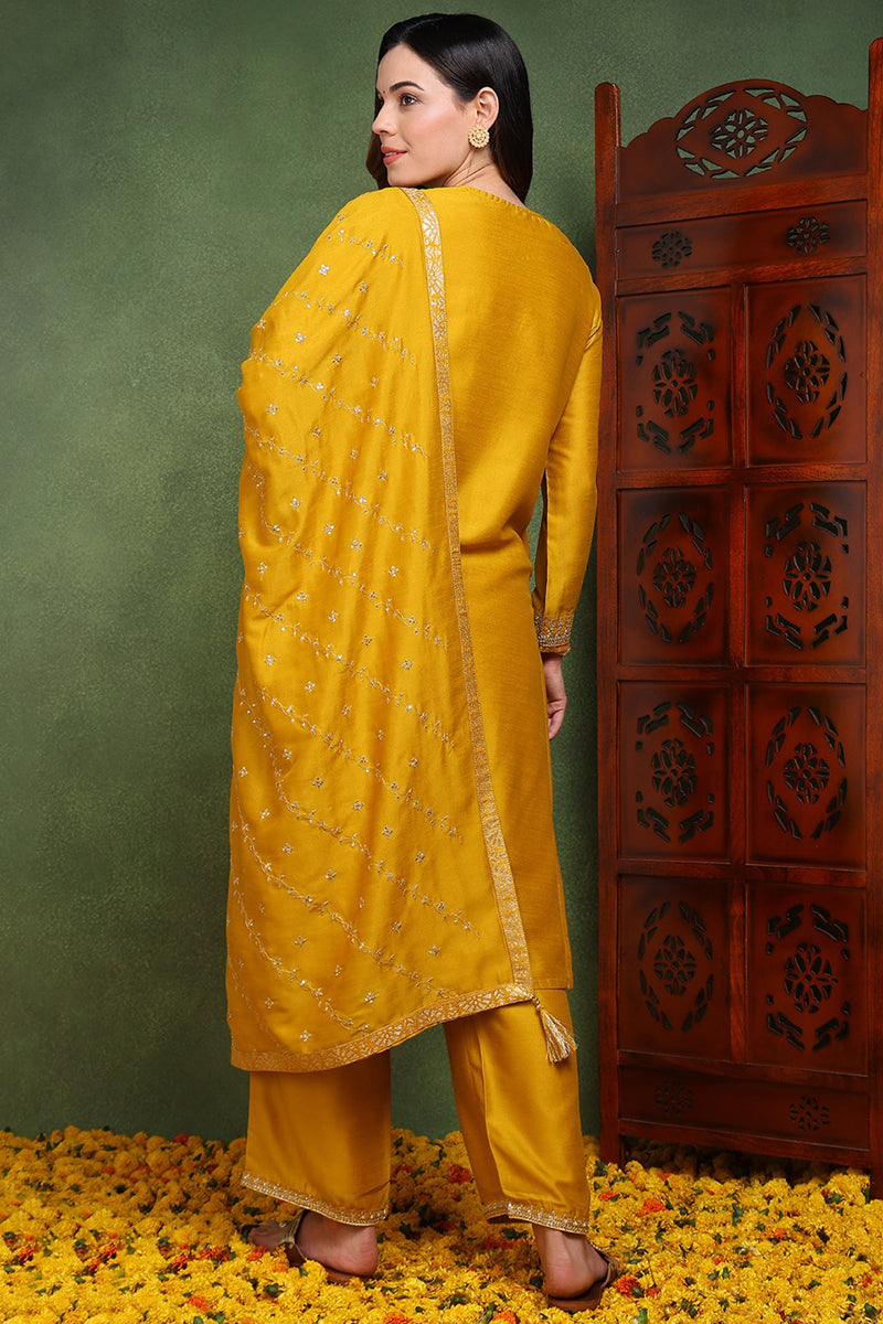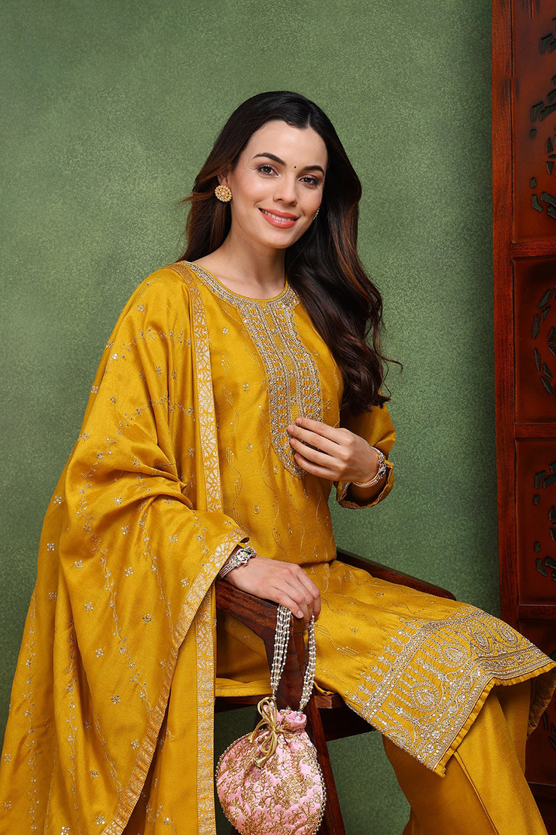 Silk Blend Mustard Embroidered Straight Kurta Pant With Dupatta PKSKD1817