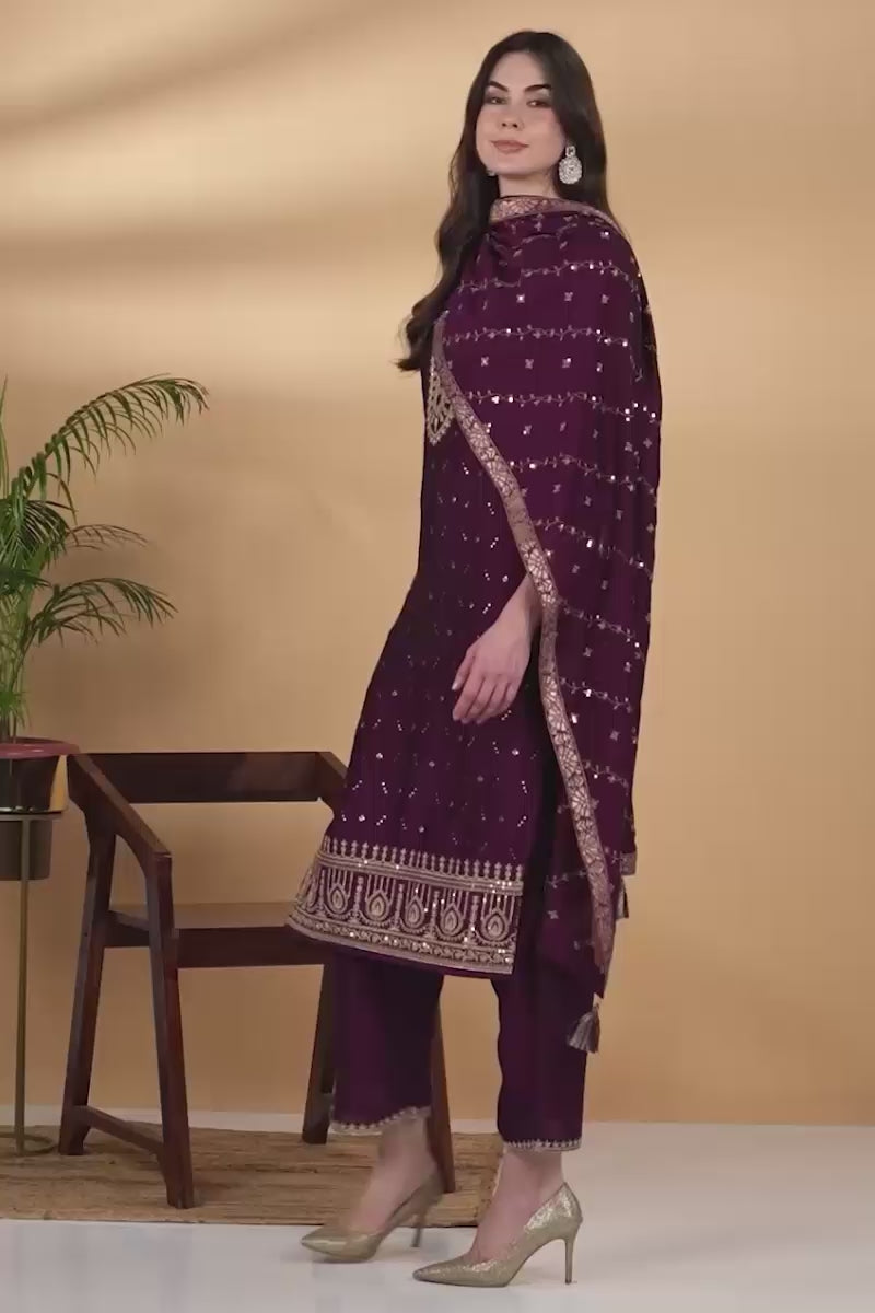 Silk Blend Wine Embroidered Straight Kurta Pant With Dupatta PKSKD1816