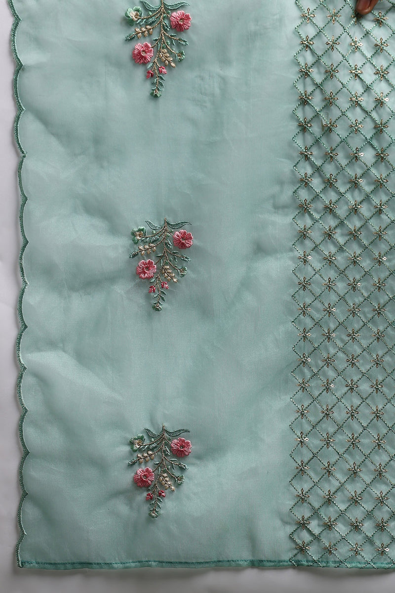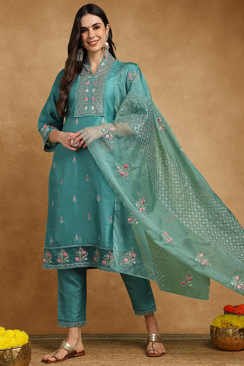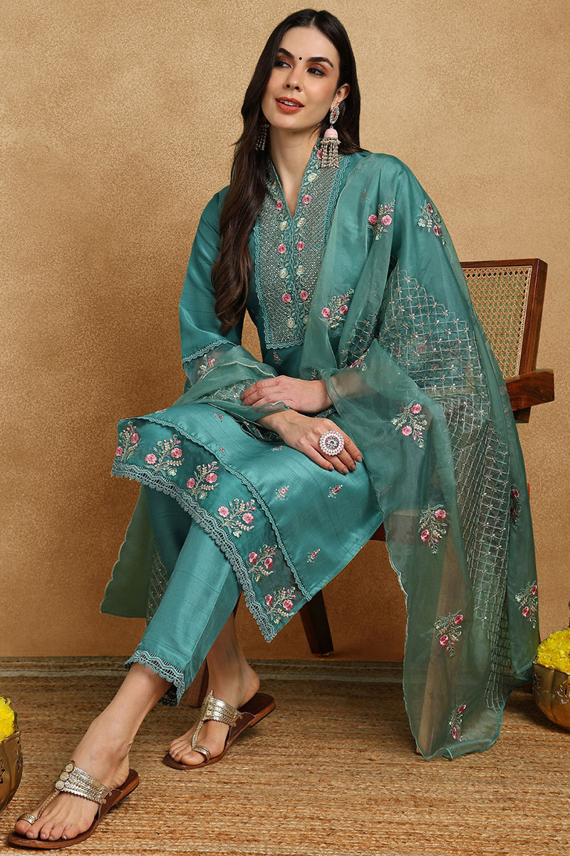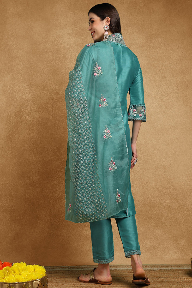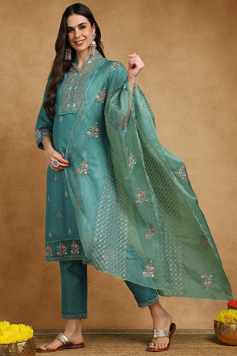 Teal Green Silk Blend Solid Embroidered Straight Suit Set PKSKD2427