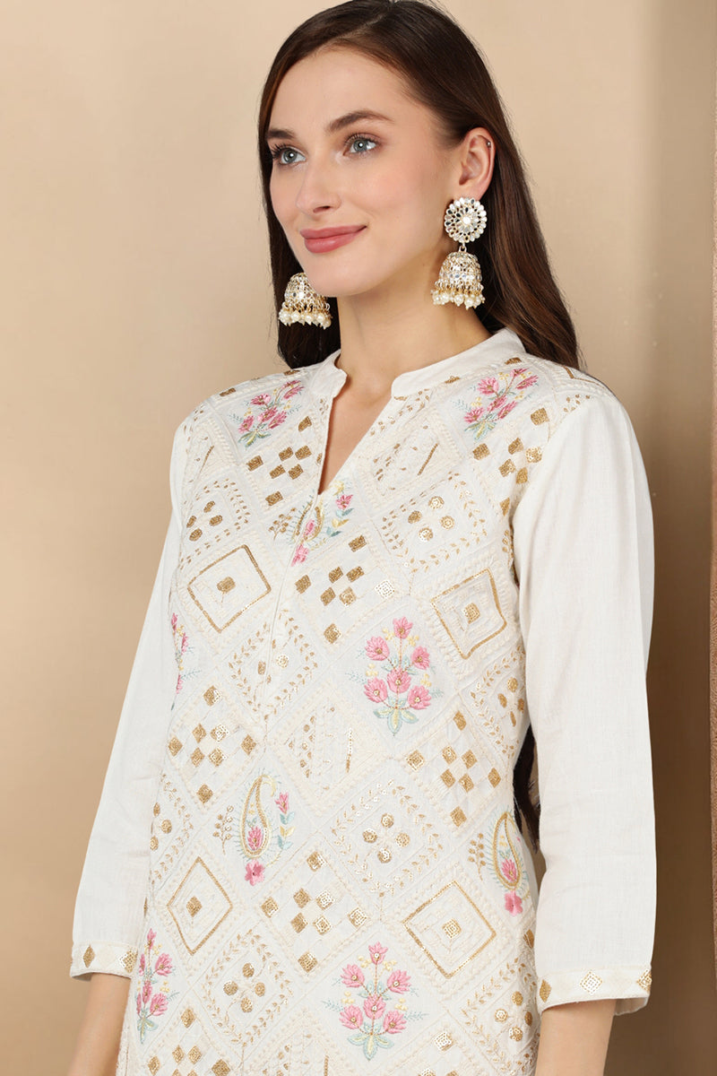 White Pure Cotton Ethnic Motifs Straight Kurta Trousers With Dupatta VKSKD1699