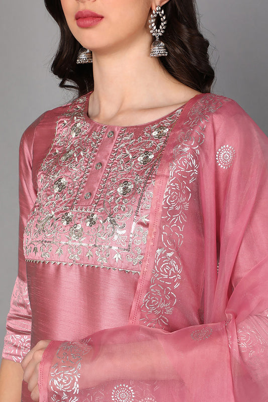 Pink Floral Yoke Design Panelled Suit Set PKSKD1432