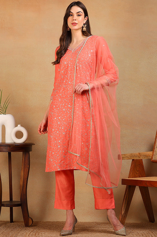 Coral Peach Silk Blend Solid Embroidered Straight Regular Suit Set PKSKD2309
