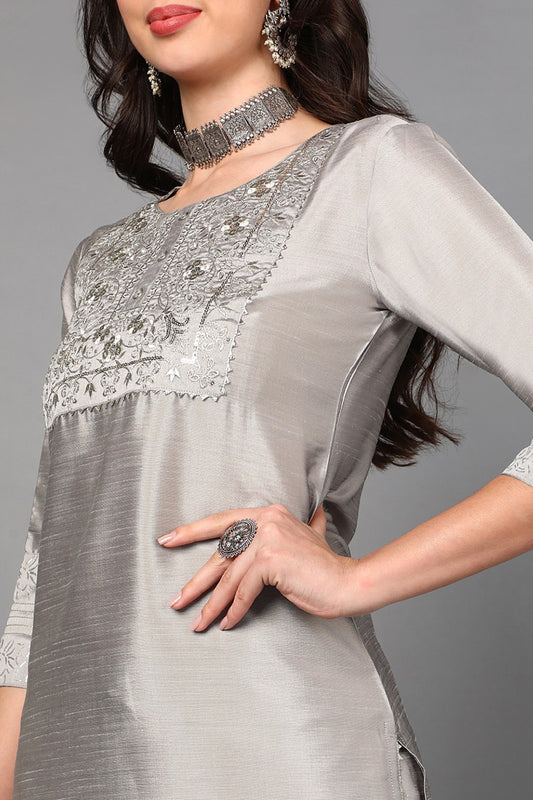 Grey Floral Yoke Design Panelled Suit Set PKSKD1433