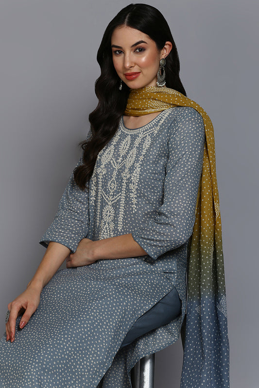 Grey Cotton Bandhani Straight Suit Set VKSKD1873