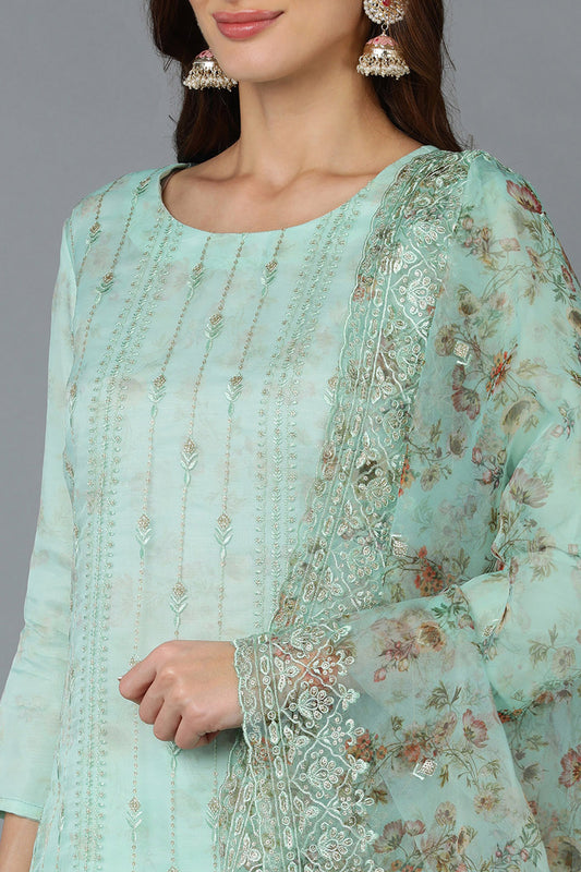 Sea Green Organza Embroidered Kurta Pant With Dupatta PKSKD1796