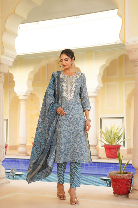 Grey Silk Blend Straight Kurta Pant With Dupatta VKSKD1706