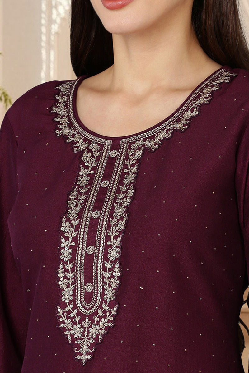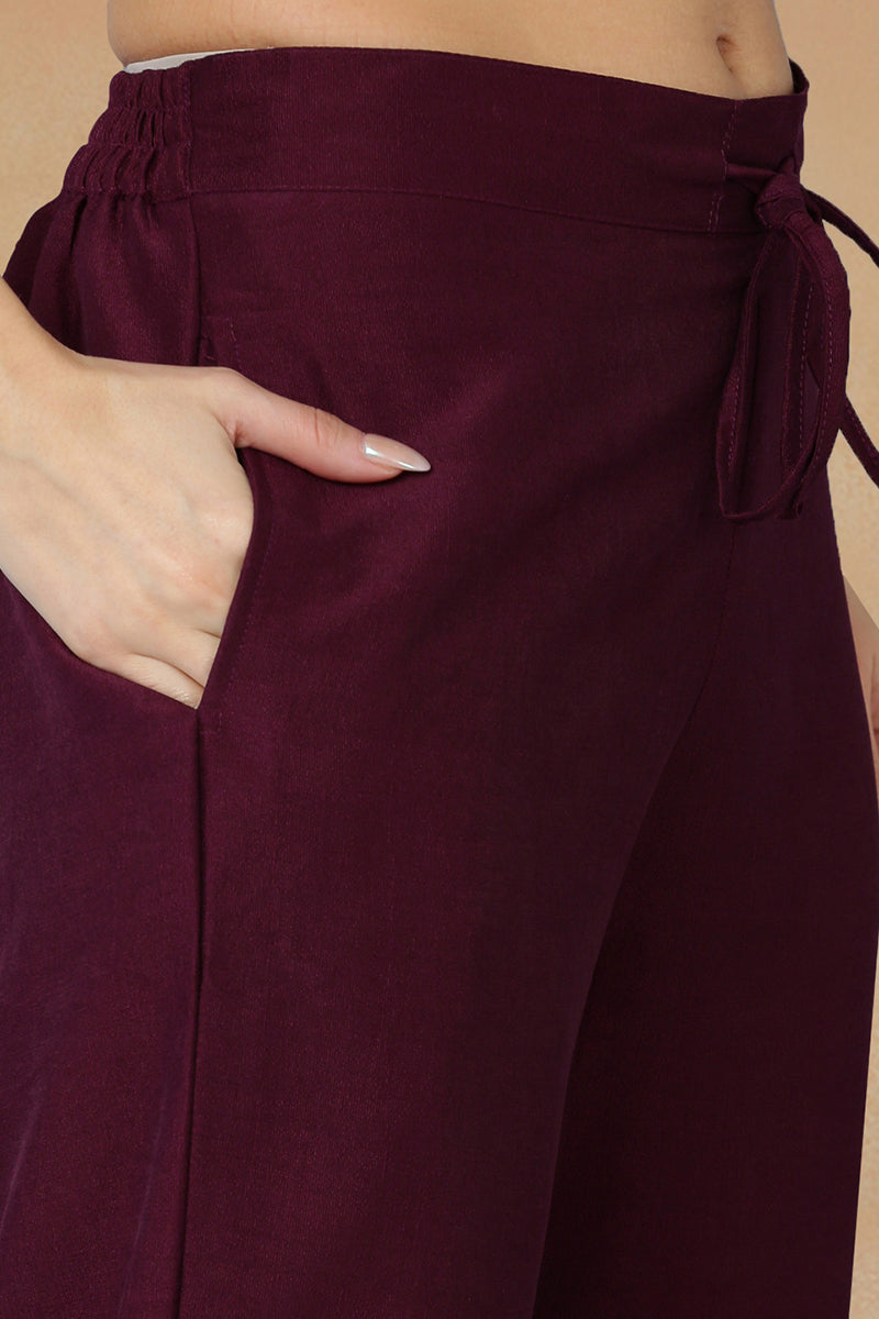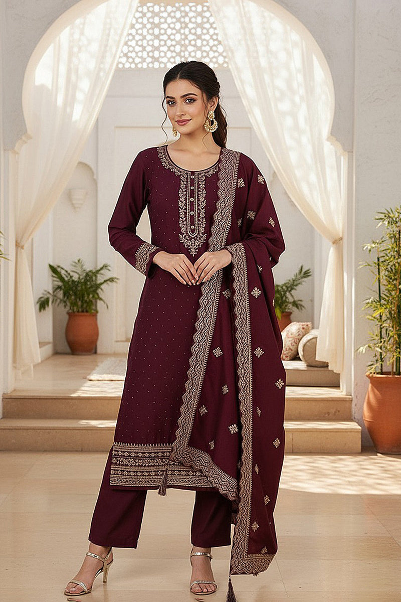Burgundy Silk Blend Solid Straight Kurta Trousers With Dupatta PKSKD1759