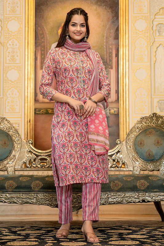 Pink Cotton Straight Suit Set VKSKD1056