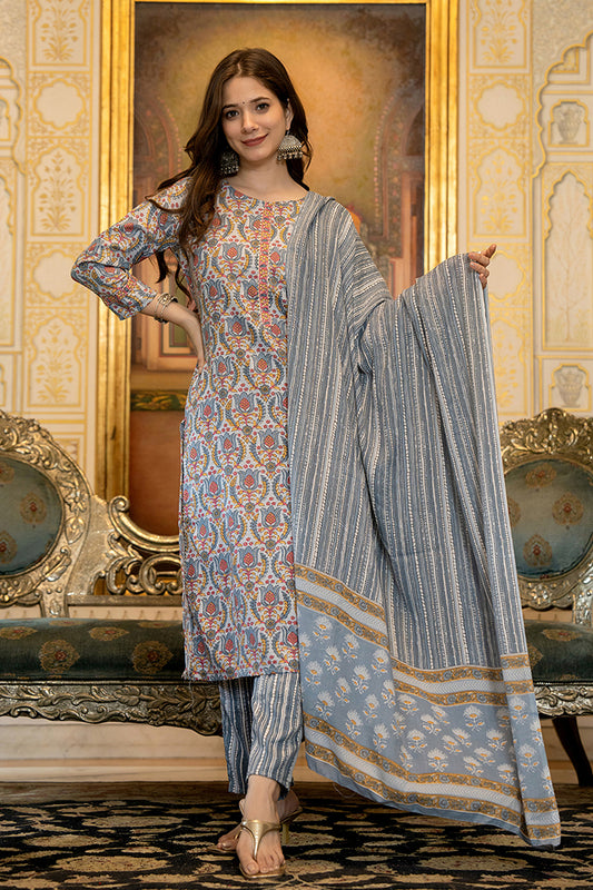 Women Cotton Blue Ethnic Motifs Printed Straight Kurta Palazzo Dupatta Set VKSKD1121