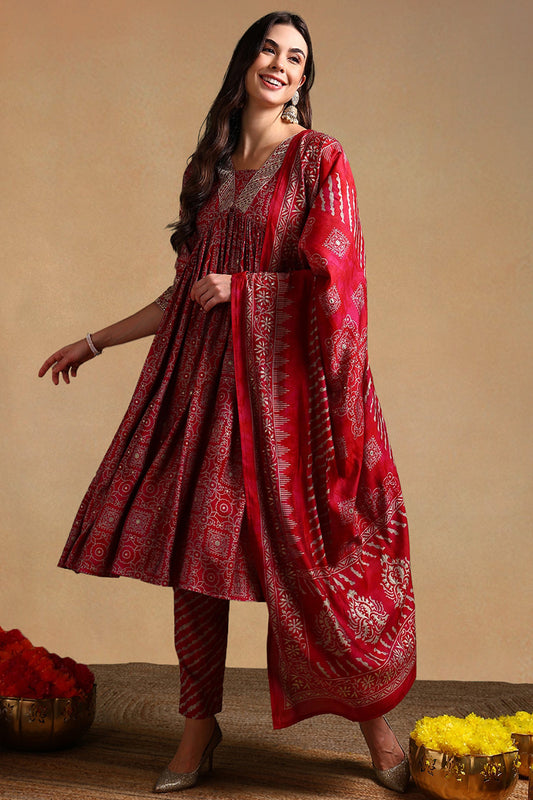 Maroon Silk Blend Ethnic Motifs Printed Flared Suit Set PKSKD2204