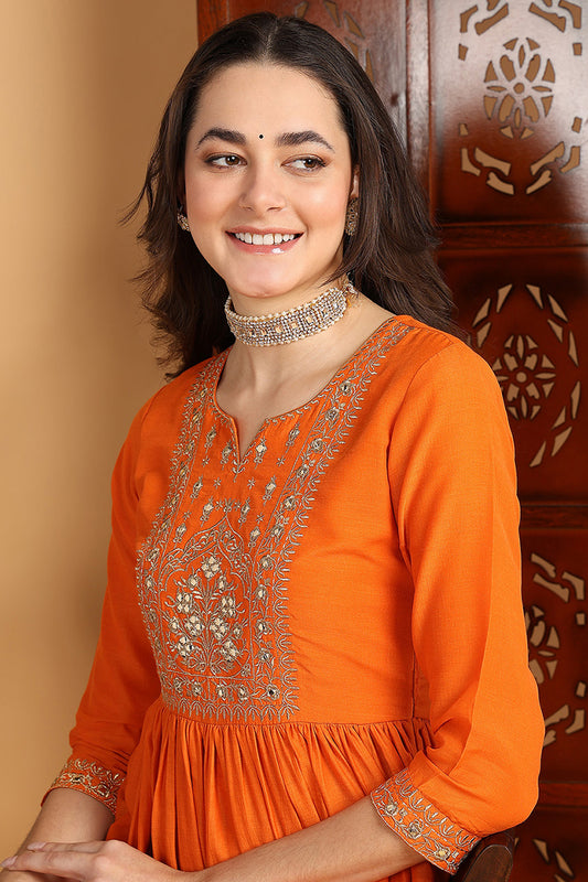 Orange Cotton Blend Solid Embroidered A-Line Suit Set PKSKD2377