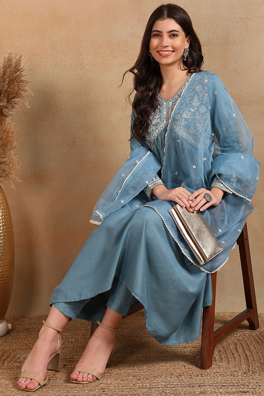 Blue Silk Blend Solid Embroidered Anarkali Suit Set PKSKD2013