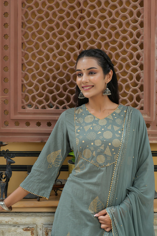 Cotton Grey Paisley Printed Straight Kurta Palazzo Dupatta Set VKSKD1104