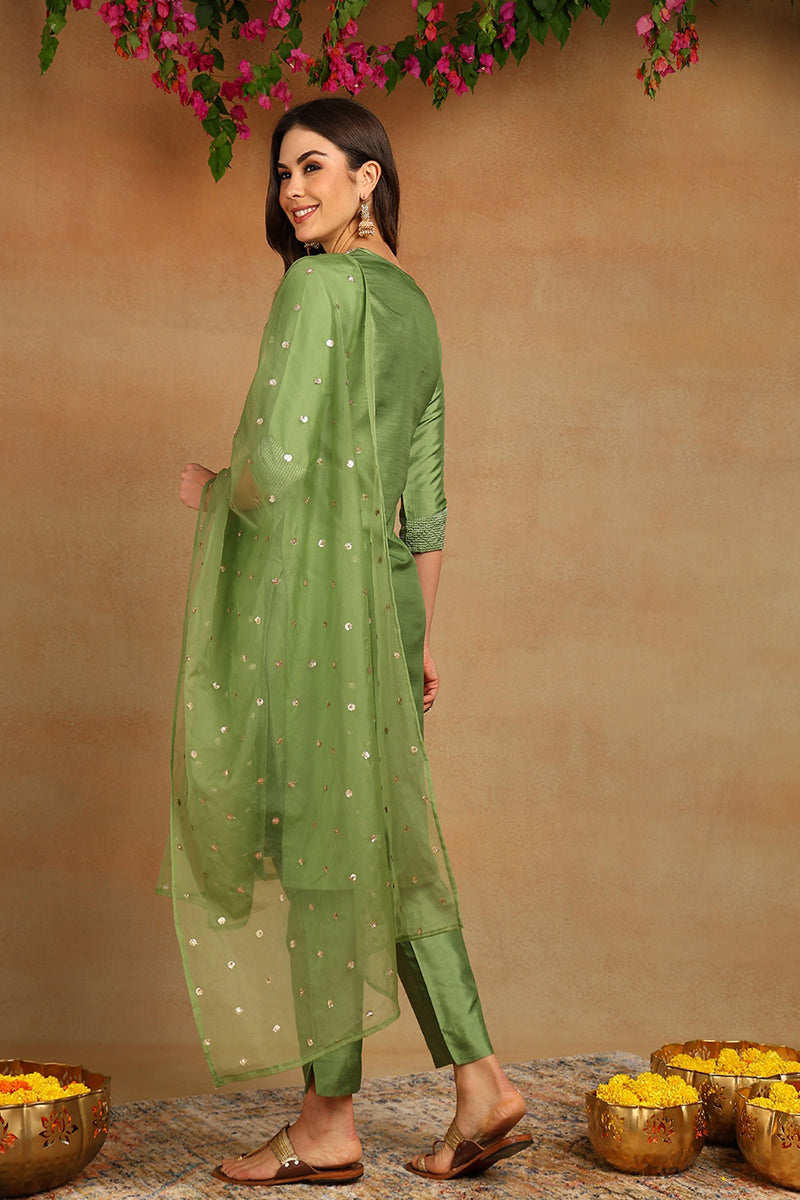 Green Poly Silk Solid Yoke Design Kurta Trousers With Dupatta PKSKD1589