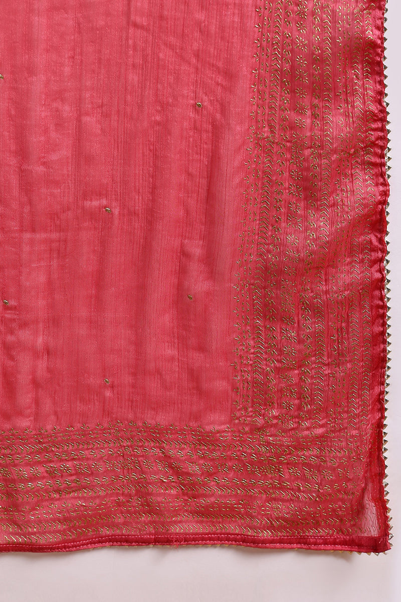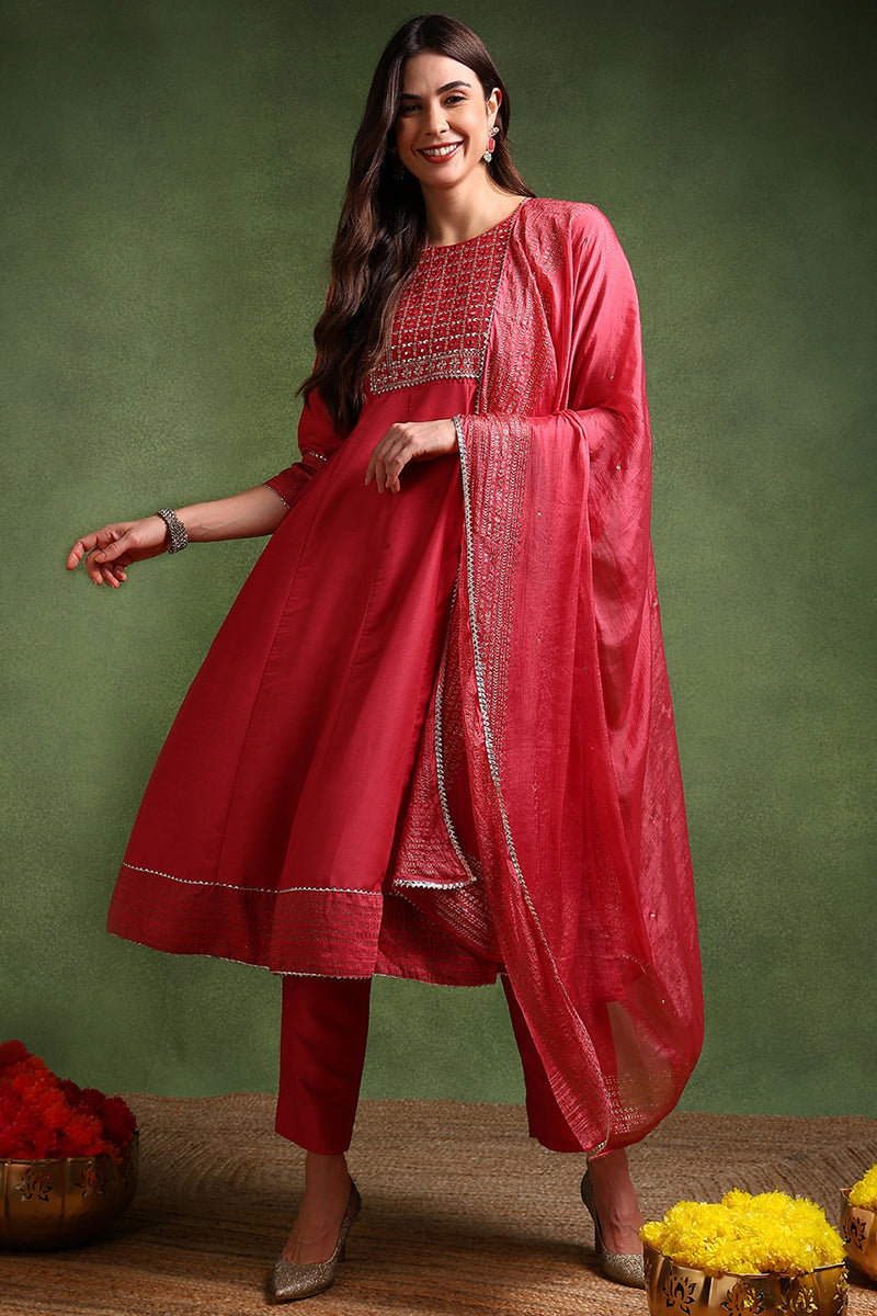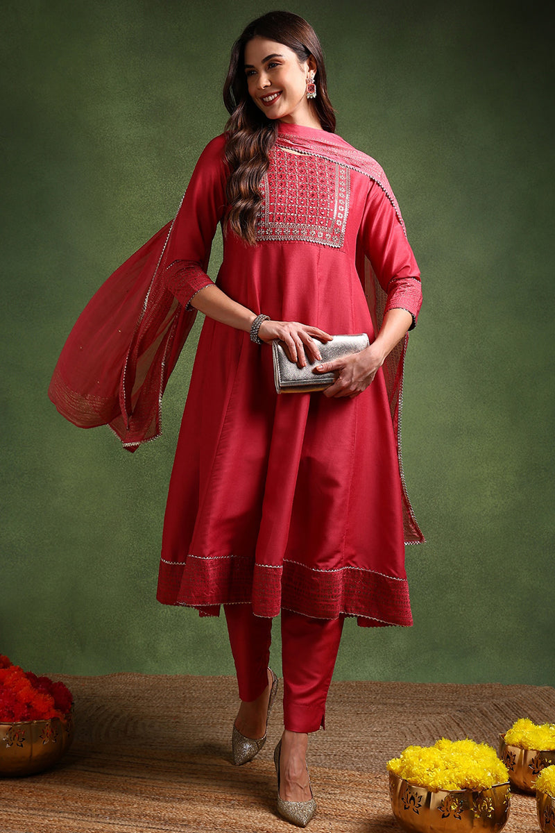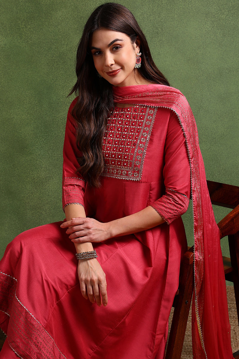 Rose Poly Silk Solid Yoke Design Kurta Trousers With Dupatta PKSKD1579