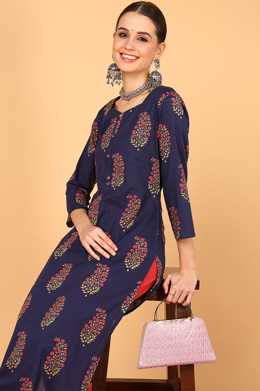 Navy Blue Floral Printed Keyhole Neck Kurta VCK8213