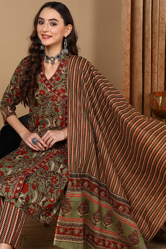 Green Pure Cotton Floral Printed Angarkha Suit Set VKSKD2067