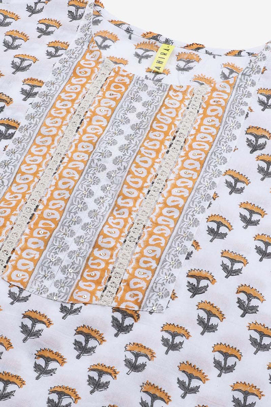 White Cotton Blend Floral Printed Straight Suit Set VKSKD2205