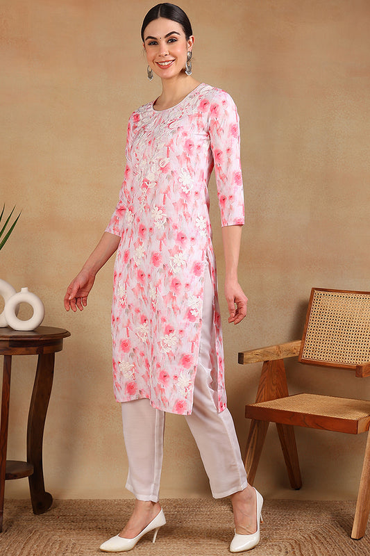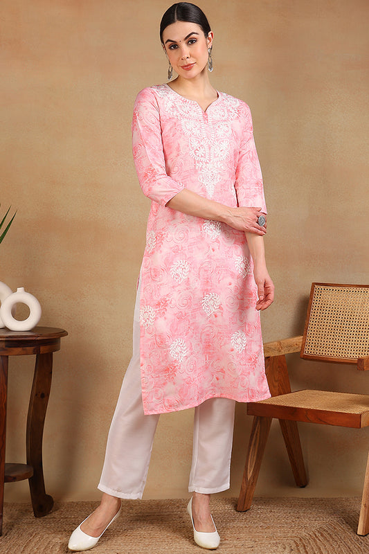 Pink Cotton Blend Embroidered Abstract Printed Straight Kurta VCK9758