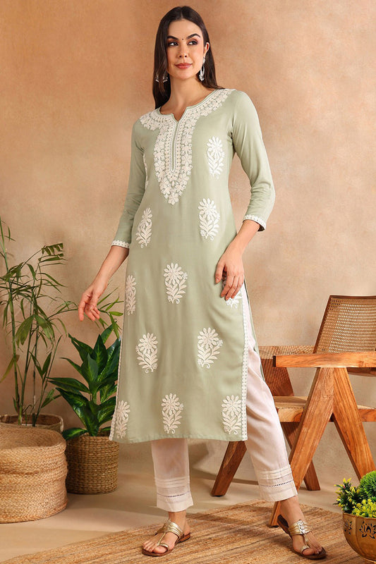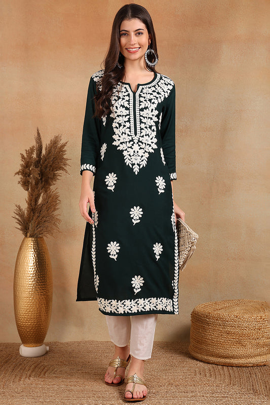 Green Viscose Rayon Solid Embroidered Chikankari Straight Kurta VCK9770GRN