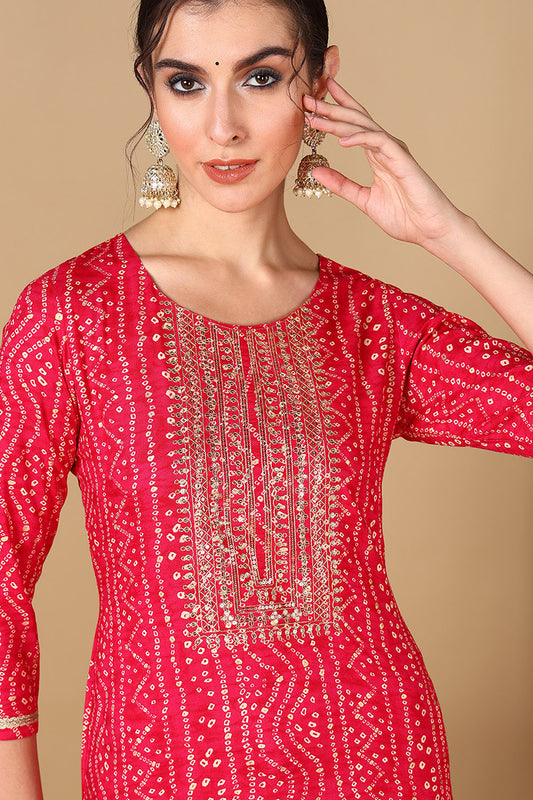 Pink Viscose Rayon Bandhani Embroidered Straight Kurta VCK9622
