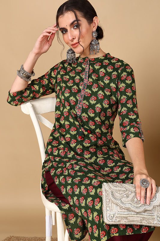 Green Cotton Floral Printed Straight Kurta VCK9672