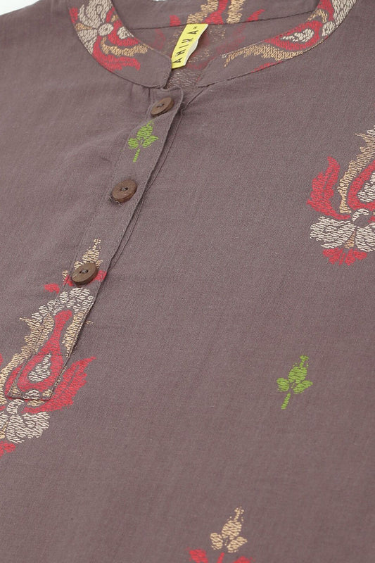 Taupe Cotton Ethnic Motifs Regular Tunic Top VT1102