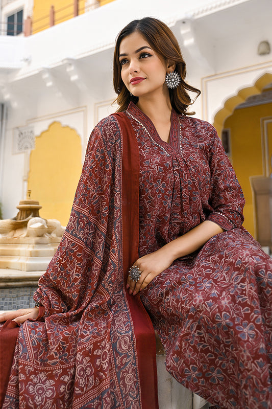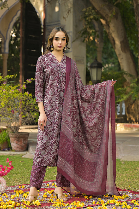 Burgundy Rayon Blend Floral Printed Straight Suit Set VKSKD2293