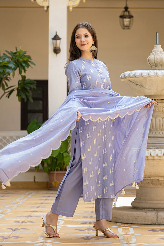 Blue Silk Blend Solid Embroidered Straight Trouser Suit Set VKSKD1982