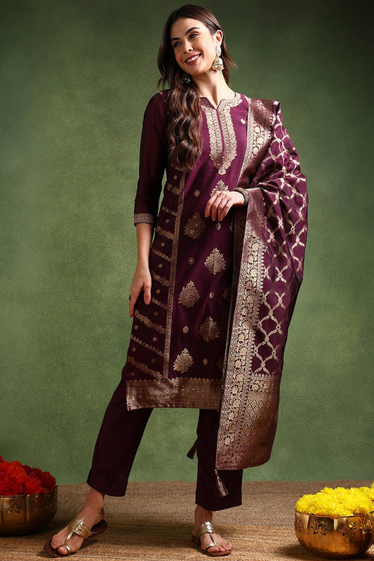 Dark Wine Chanderi Silk Woven Design Straight Trouser Suit Set PKSKD2694
