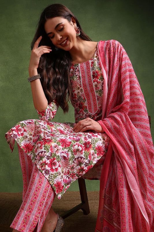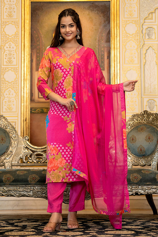 Pink Silk Blend Floral Printed Straight Suit Set With Trouser Bottom PKSKD2703