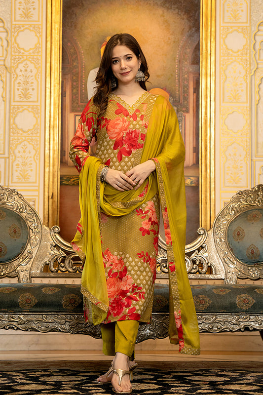 Green Silk Blend Floral Printed Straight Suit Set With Trouser Bottom PKSKD2704